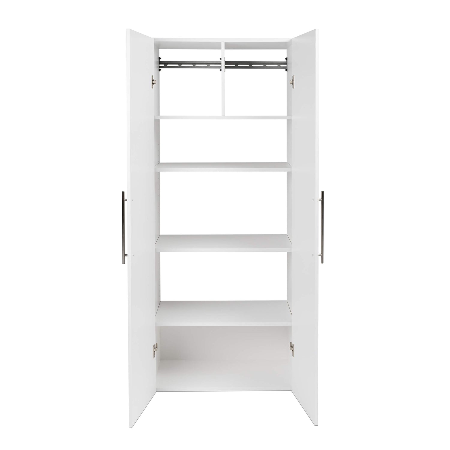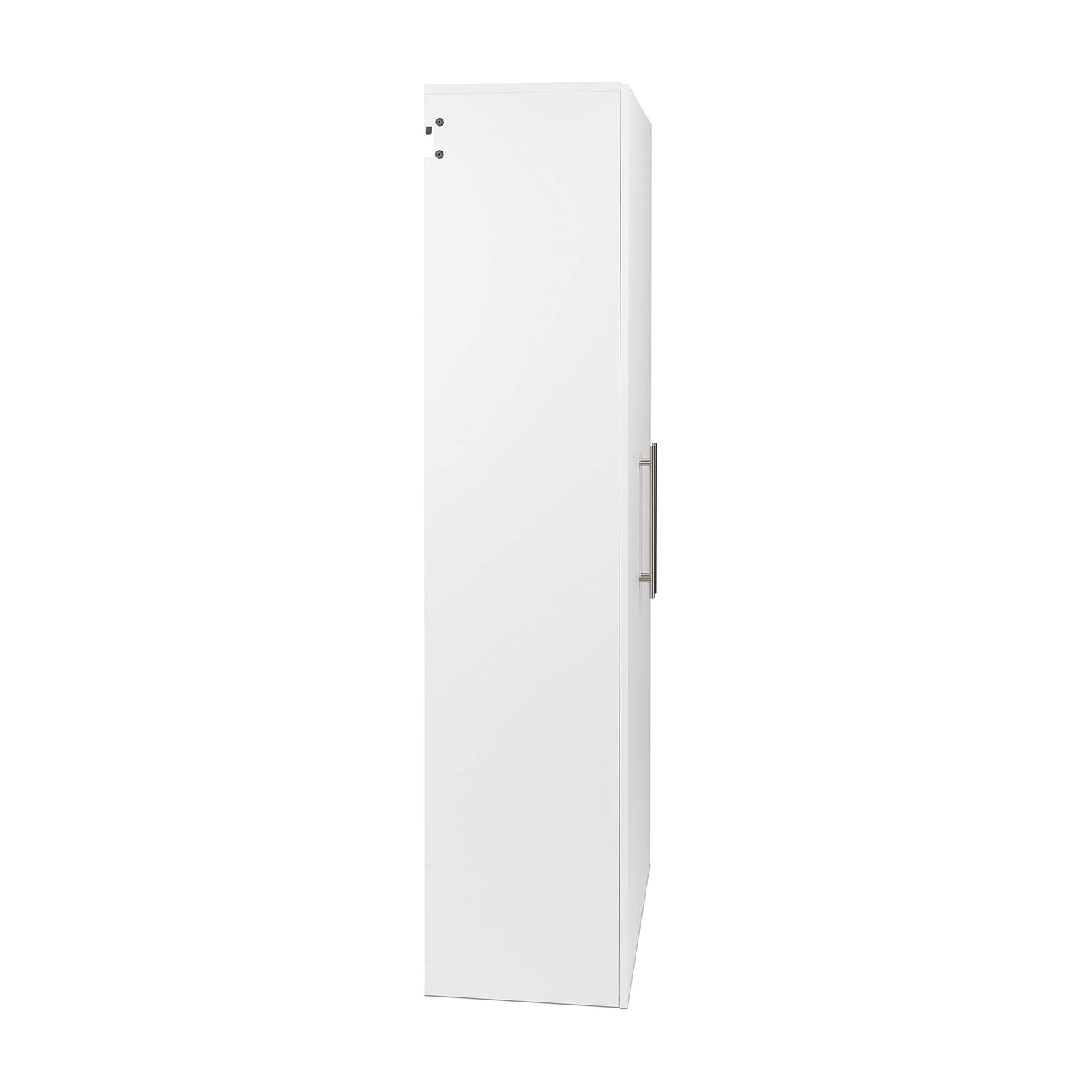 Details: Welcome in a new organizational system with the Prepac Hang-Ups Large Storage Cabinet. This wall-mounted cabinet features two sophisticated clean line doors on adjustable hinges, three adjustable shelves and one fixed shelf with a middle divider, offering flexibility to fit to your ever-changing storage needs. Adorned with a fresh white laminate finish and two satin nickel-finished metal pull handles, this multi-use utility cabinet will provide subtle storage anywhere. Designed to be secured into the wall in your garage, laundry room, basement, workshop, or office with the included heavy duty metal rail and hook system, your stowed items will be kept safe from debris and the ground will be easier to clean. The large internal capacity grants a repository for your tools, linens, gardening equipment, documents, clothing, and more while keeping them compartmentalized and clutter-free. This durable cabinet ships flat packed and ready to be assembled upon delivery with an included instructional booklet, hanging rails, and fastening bolts. This organizer shelf unit is made with non-toxic, CARB-2 compliant laminated composite woods for durability. Measuring 16"D x 30"W x 72"H, there is no limit to what you can safely stow away. Pair this unit with other items from the Hang-Ups collection.