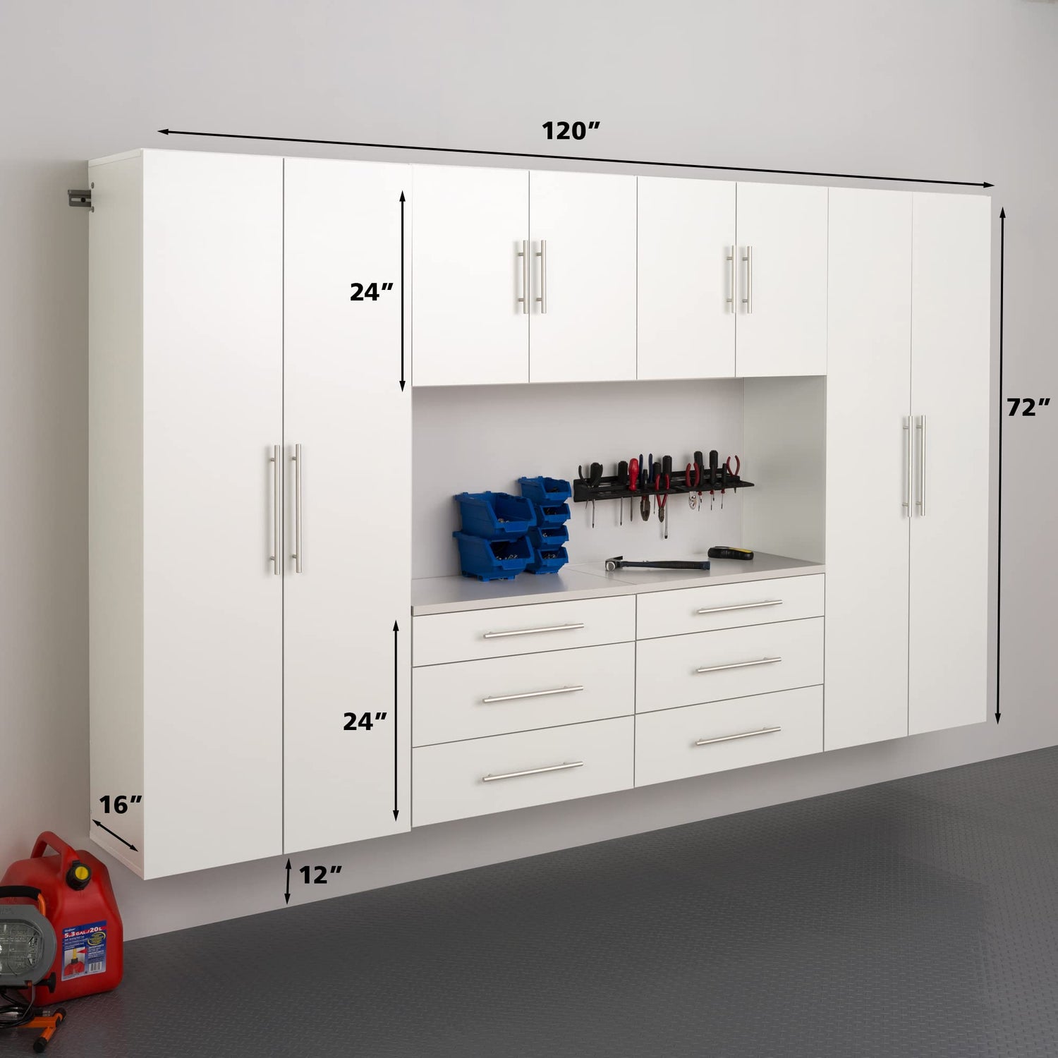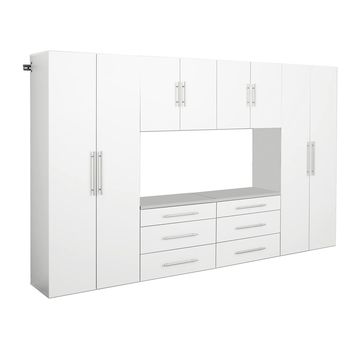 Details: Say goodbye to clutter and welcome in a new organizational system with the Prepac Hang-Ups 6-Piece Storage Cabinet Set. This versatile space-saving collection includes two large Hang-Ups Storage Cabinets, two Hang-Ups Base Storage Cabinets, and two Hang-Ups Upper Storage Cabinets. The base storage unit cabinets include three pull-out drawers on smooth roller glides, while the other cabinet units feature multiple integrated shelves, offering flexibility to fit to your ever-changing storage needs. Adorned with a light gray laminate finish and satin nickel-finished metal pull handles, these multi-use utility cabinets blend right into your home. Designed to be secured into a sturdy wall with the included heavy duty metal rail and hook system, your stowed items will be kept safe from debris while allowing for easy clean-upon the ground or other surfaces underneath. Create your ideal workspace in your garage or workshop, arranging this expansive collection to your preference. These durable cabinets ship flat packed and ready to be assembled upon delivery with an included instructional booklet, hanging rails and fastening bolts. Each organizer unit is made with non-toxic, CARB-2 compliant laminated composite woods. Measuring 16"D x 120"W x 72"H total, there is no limit to what you can safely stow away.