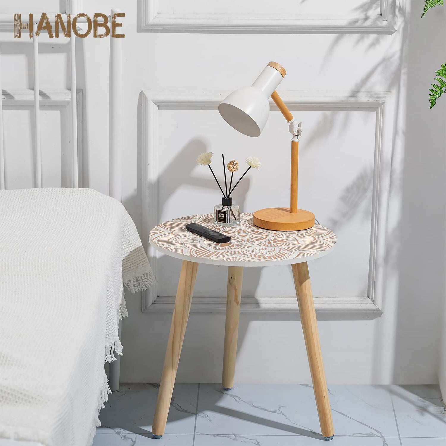 Hanobe Small Round Side Table: Boho End Tables for Living Room Bohemian Accent Bedside Table White Washed Bedroom Nightstand Farmhouse Home Decor Decorative with 3 Wood Legs, Easy Assembly