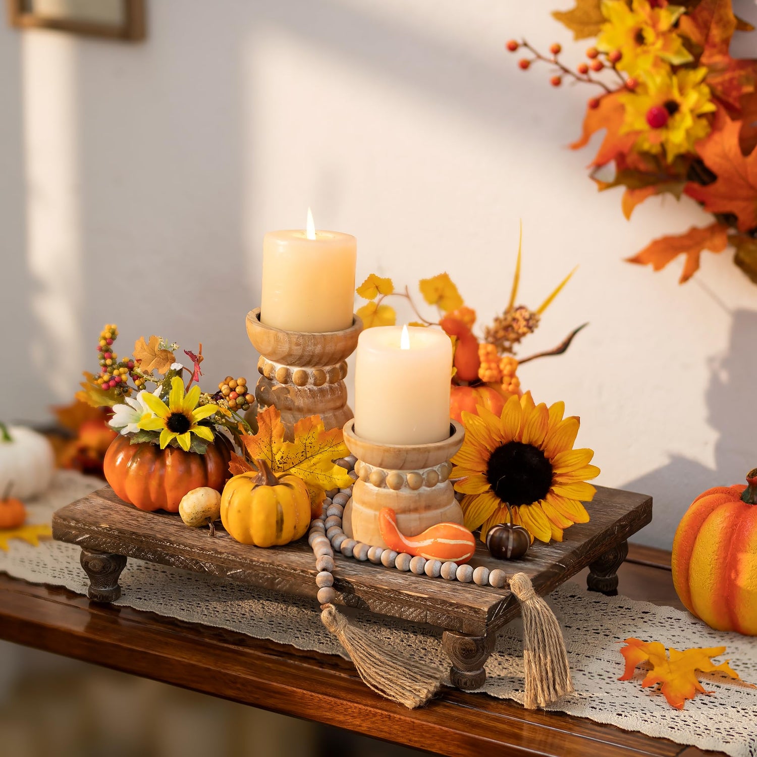 Hanobe Wooden Riser Decorative Tray: Farmhouse Wood Pedestal Display Stand Rustic Brown Tray Riser Centerpiece for Coffee Bar Kitchen Dining Room Home Table Decor, Short & Tall Footed