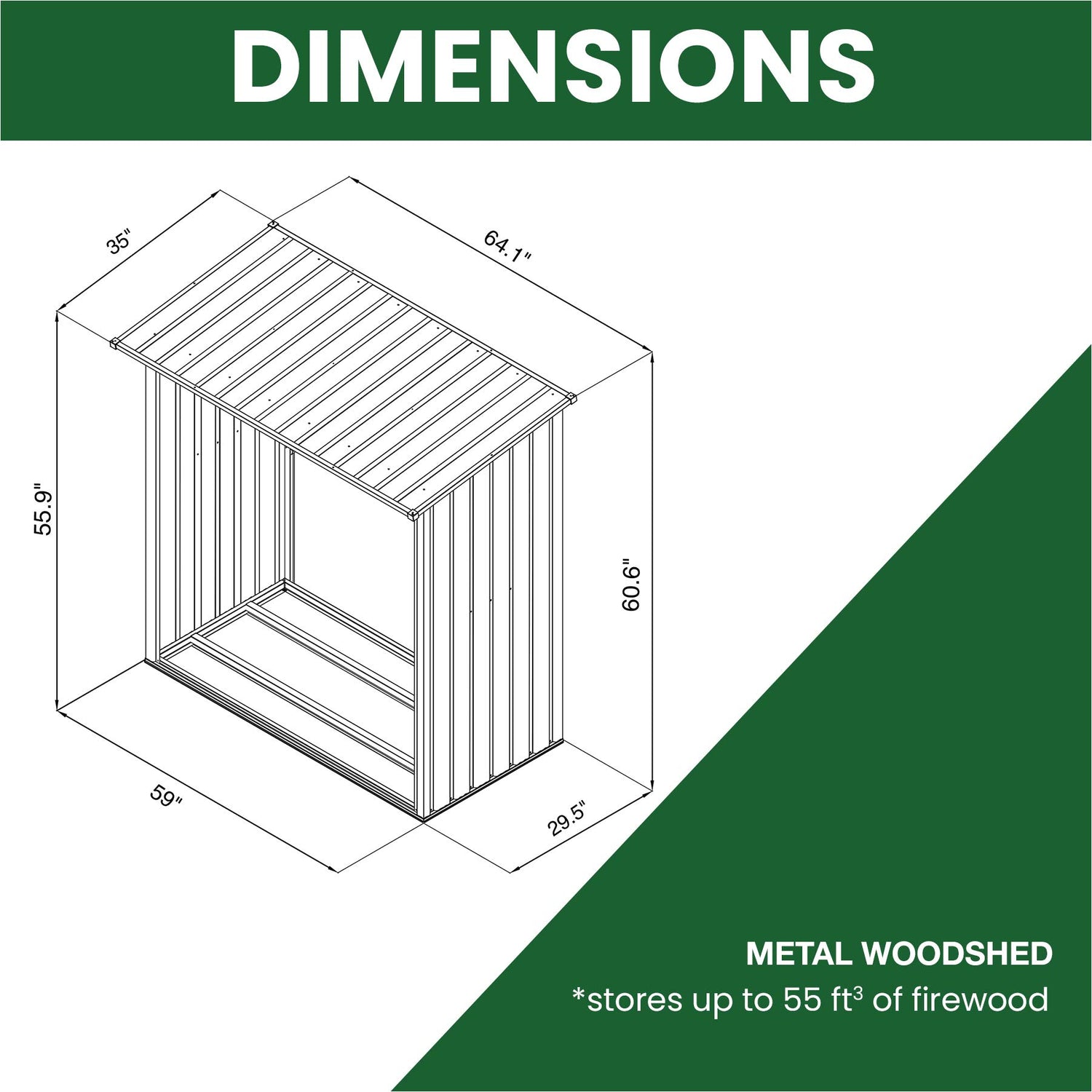- Shed Dimensions: 27.5" D x 57" W x 55" H interior dimensions; 35" D x 64" W x 61" H exterior dimensions; This backyard storage shed stores up to 55 cubic feet of stack firewood