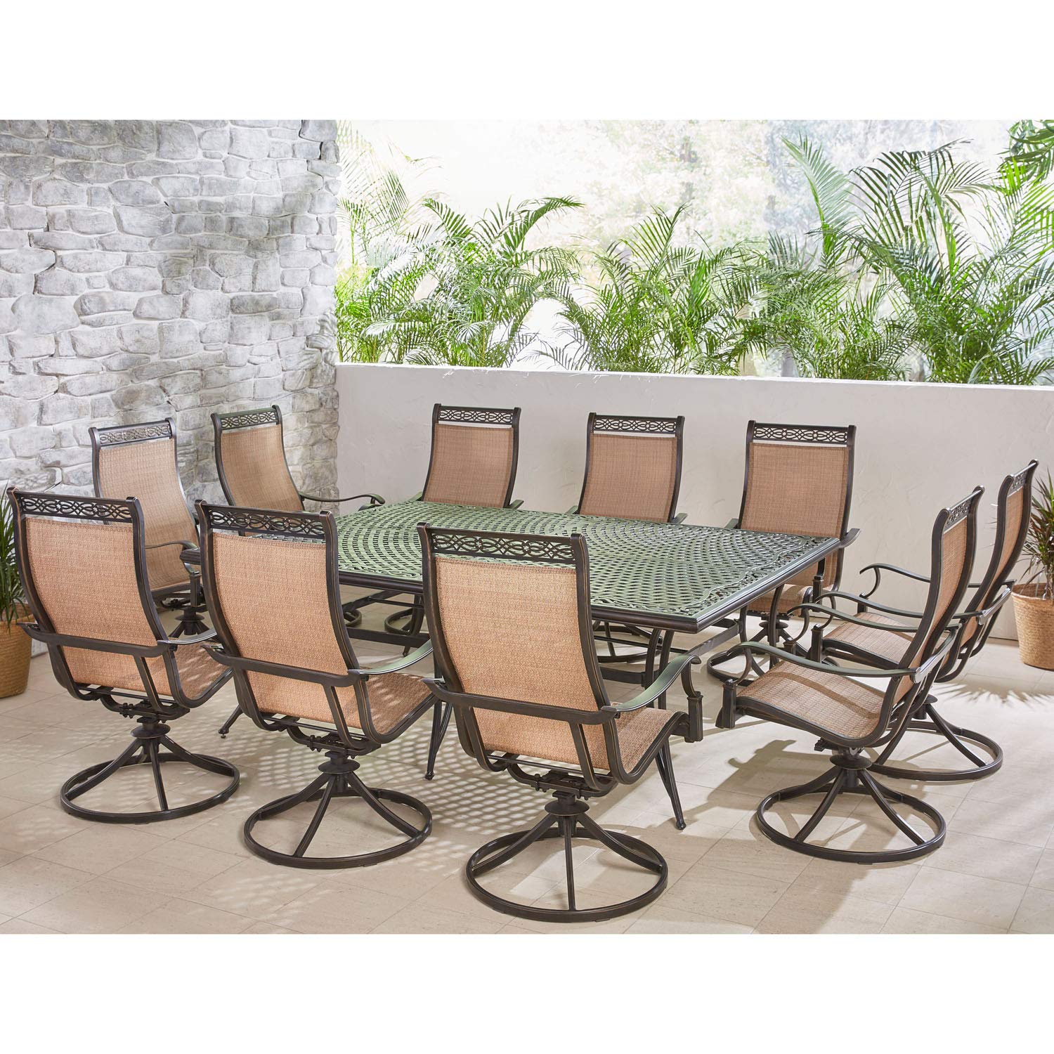 - Designed to Entertain: The Manor 11-piece dining set from Hanover includes a 60” x 84” cast aluminum accented table and 10 swivel rockers; This set is designed with stylish dark frames and neutral-toned fabric, Perfect for revamping any backyard or patio
