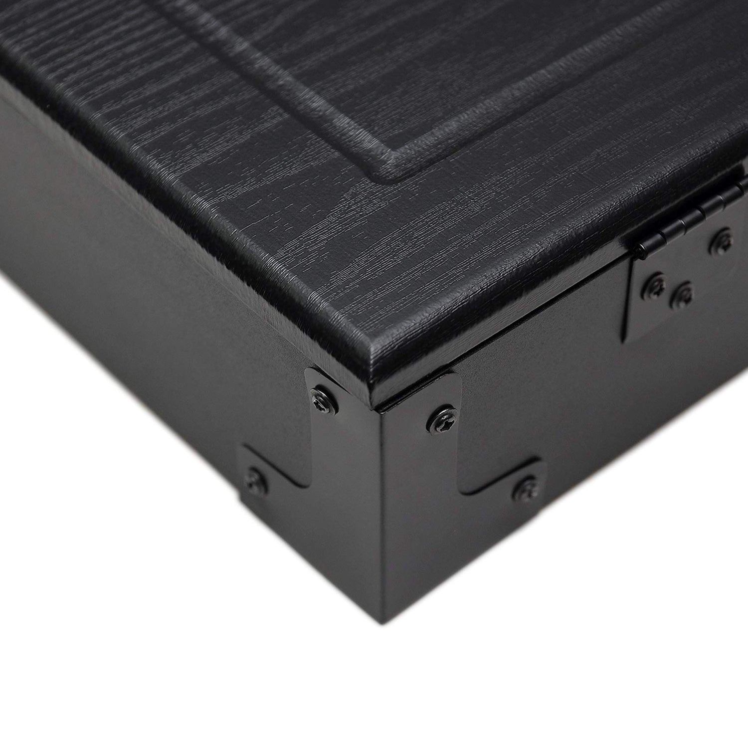 Details: Furniture style MDF with black laminated finish dartboard & cabinet set, Scoreboards inside each door panel, Reinforced corners with metal brackets Measures: H:25" x W:19 3/4" x D:3 1/4", Professional bristle steel tip dartboard with round wire. Includes hanging brackets, screws and 6 metal darts. Regulation 18" target area.