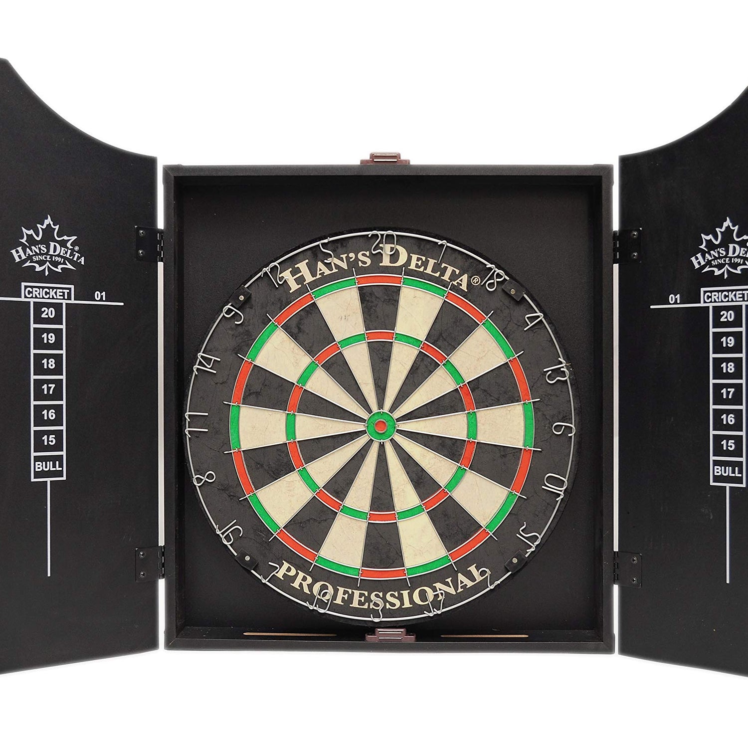 HAN'S DELTA Professional Bristle Dartboard Cabinet Set, Metal Corner Reinforcement, Regulation Steel Tip Dartboard, Includes 6 Steel Tip Darts and Scoreboards (Black)