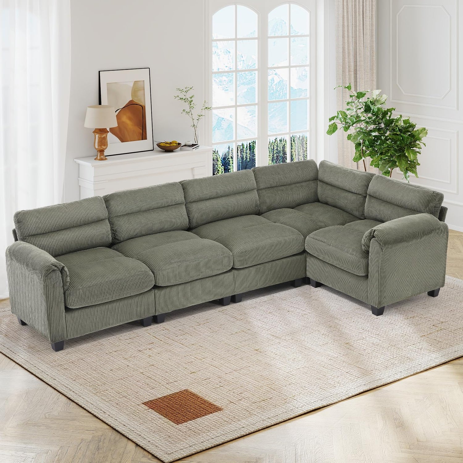 HAOMARKETS 115” Modular Sectional L Shaped Corner Sofa, Corduroy 5-Seater Couches with Thick Cushion for Living Room, Green