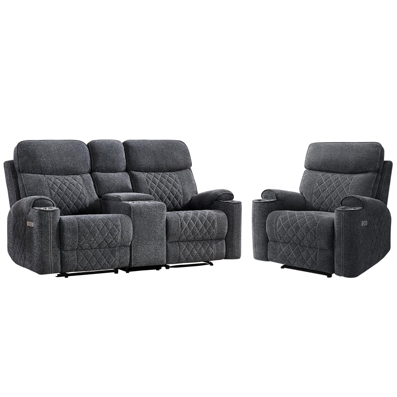 HAOMARKETS 2-Piece Power Recliner Sofa Set with Charging Port, Include Single Recliner Chair and 2-Seater Loveseat Reclining Couch with Hidden Storage and Cup Holders for Living Room, Dark Grey