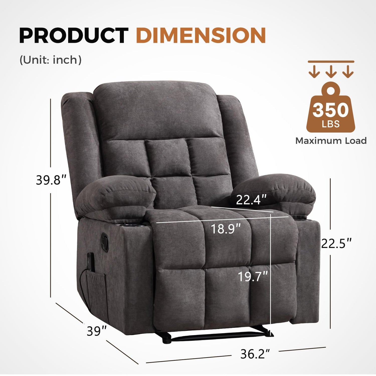 - Massage Heated Recliner: This manual recliner has 4 massage points and 1 lumbar heating point. The massage mode and intensity can be adjusted by remote control, and the pocket on the side of the recliner can hold the remote control and so on. This recliner can eliminate your body fatigue