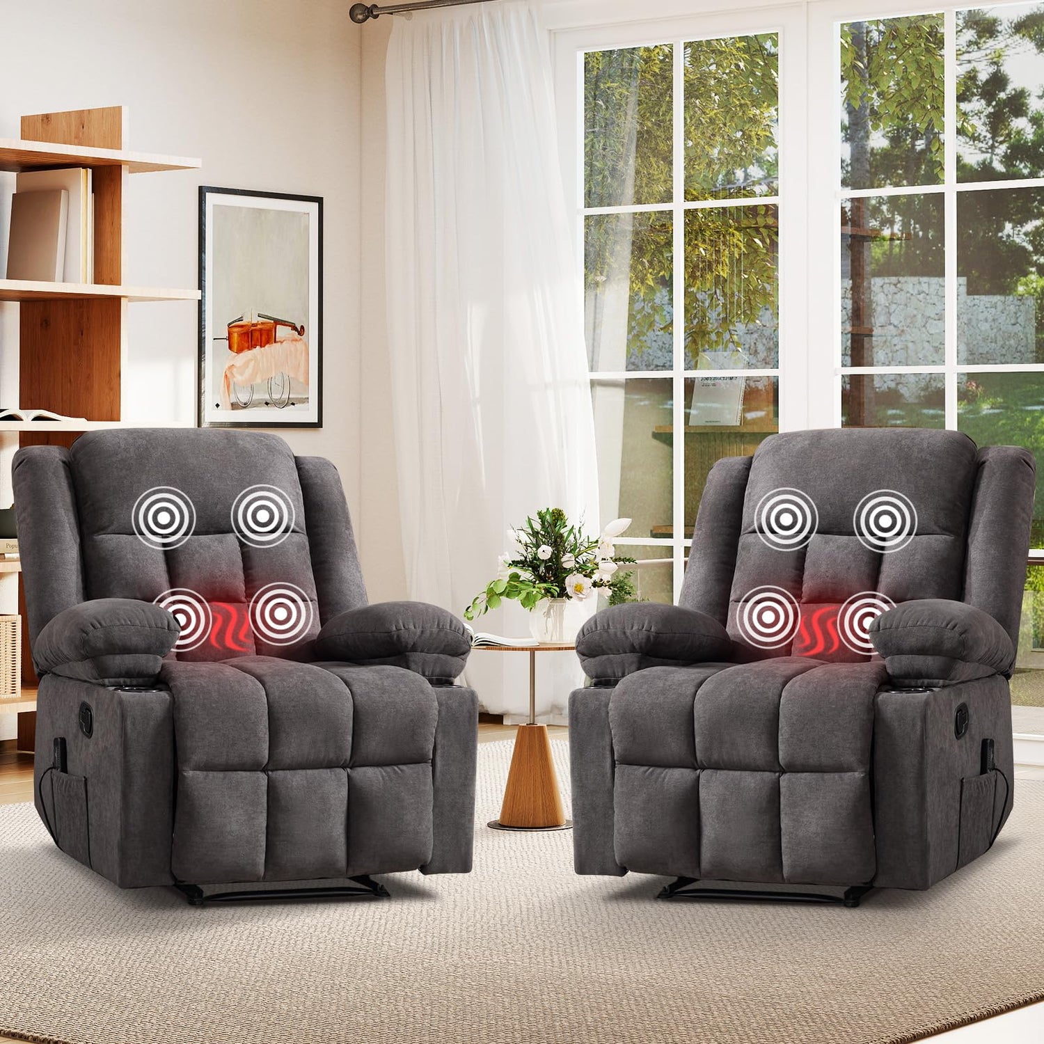 HAOMARKETS Classic Manual Recliner Set of 2 with Massage and Heat for Adults, Breathable Fabric Recliners with Two Cup Holders, Overstuffed Heavy Duty Reclining for Living Room, Grey