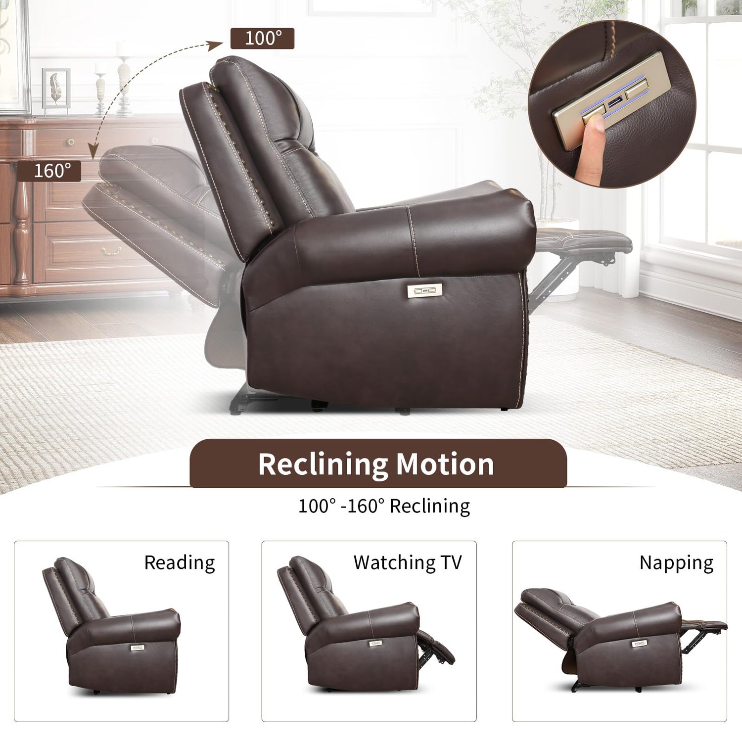 HAOMARKETS Classic Oversized Power Recliner Chair with with Rivets, Breathable Faux Leather Electric Recliner with USB Port, Overstuffed Reclining Sofa for Living Room, Dark Brown