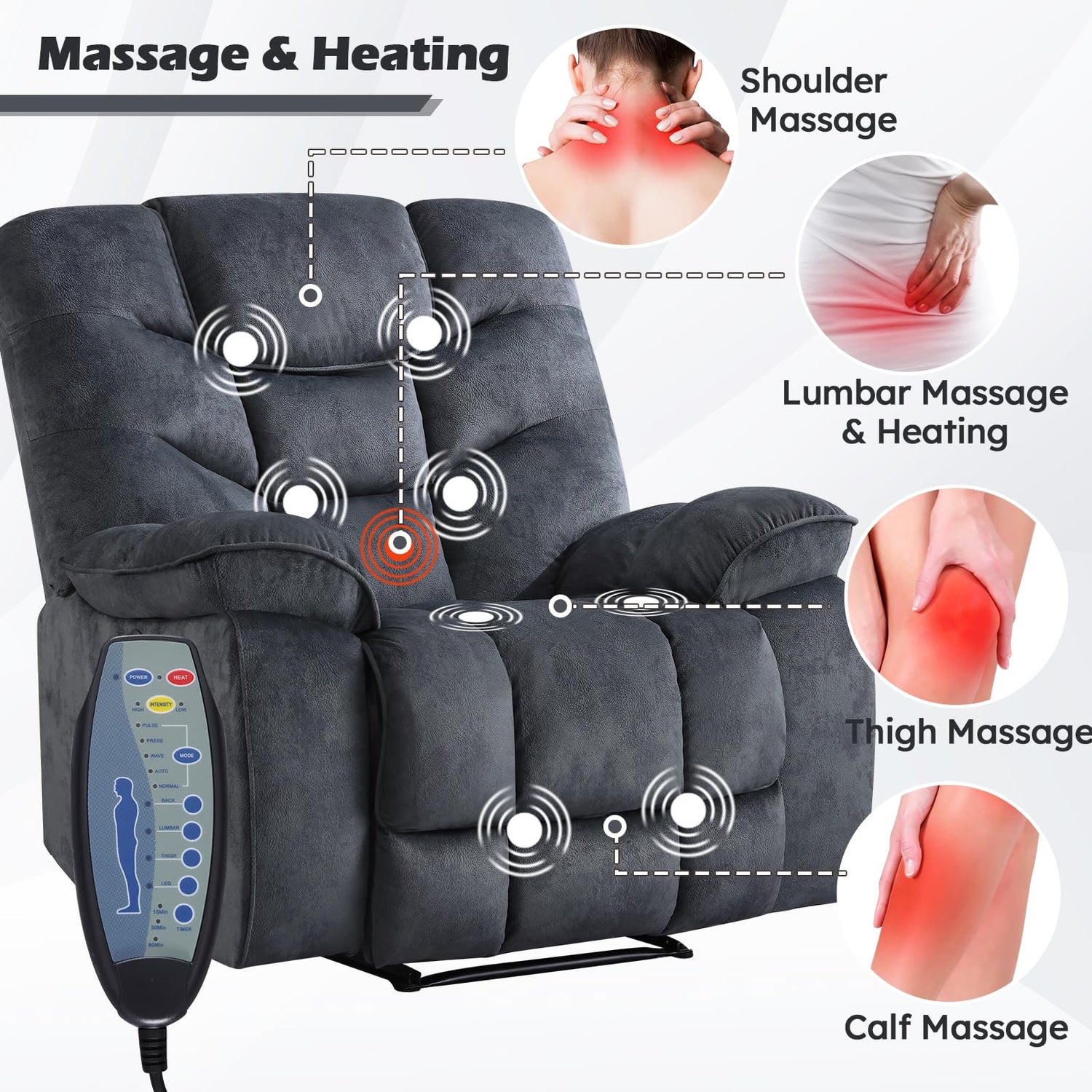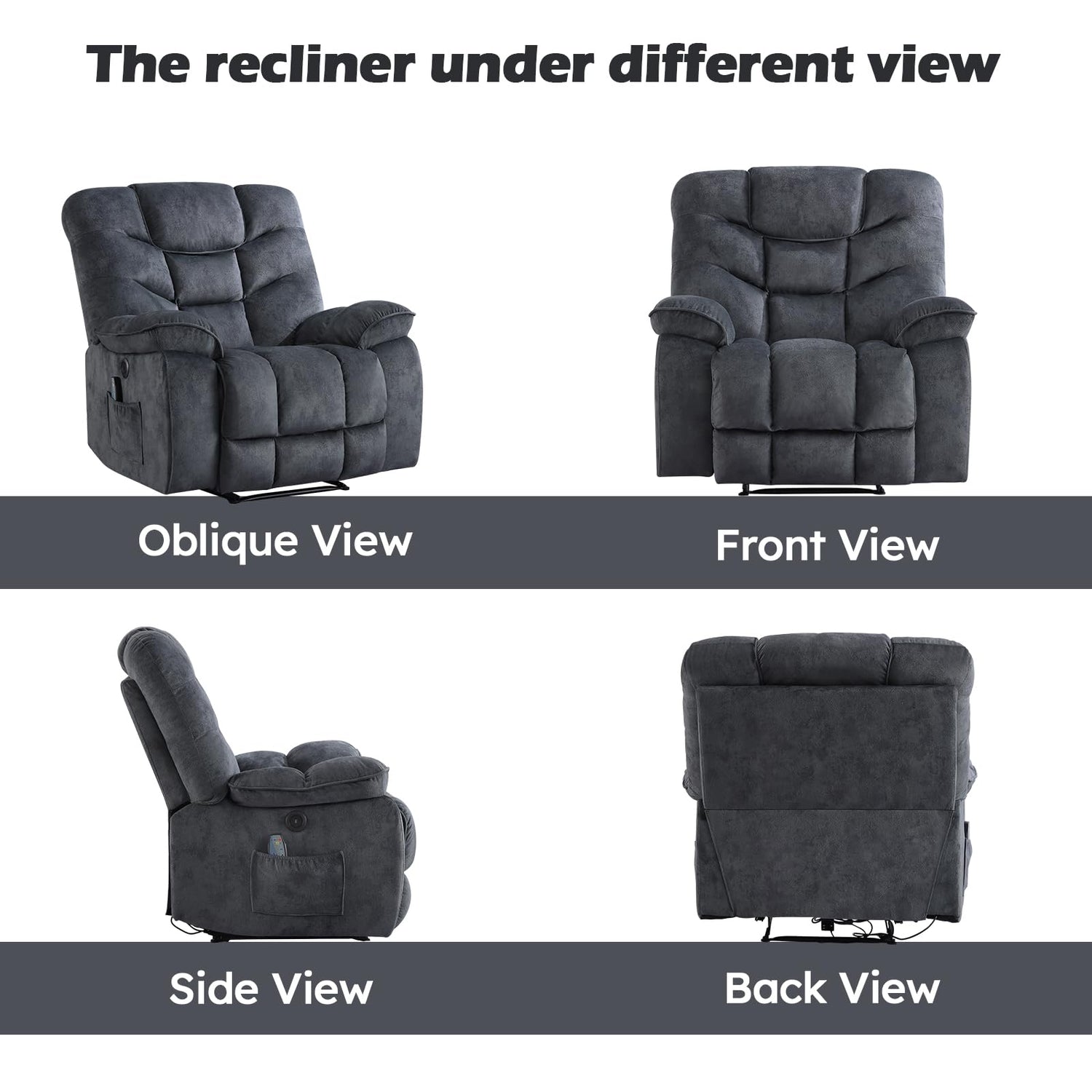 - Massage Heated Recliner: This electric recliner has 8 vibration points and 1 lumbar heating point. You can choose different modes and intensity through the remote control, which is very convenient to operate. This recliner can eliminate your fatigue and stress and help you relax