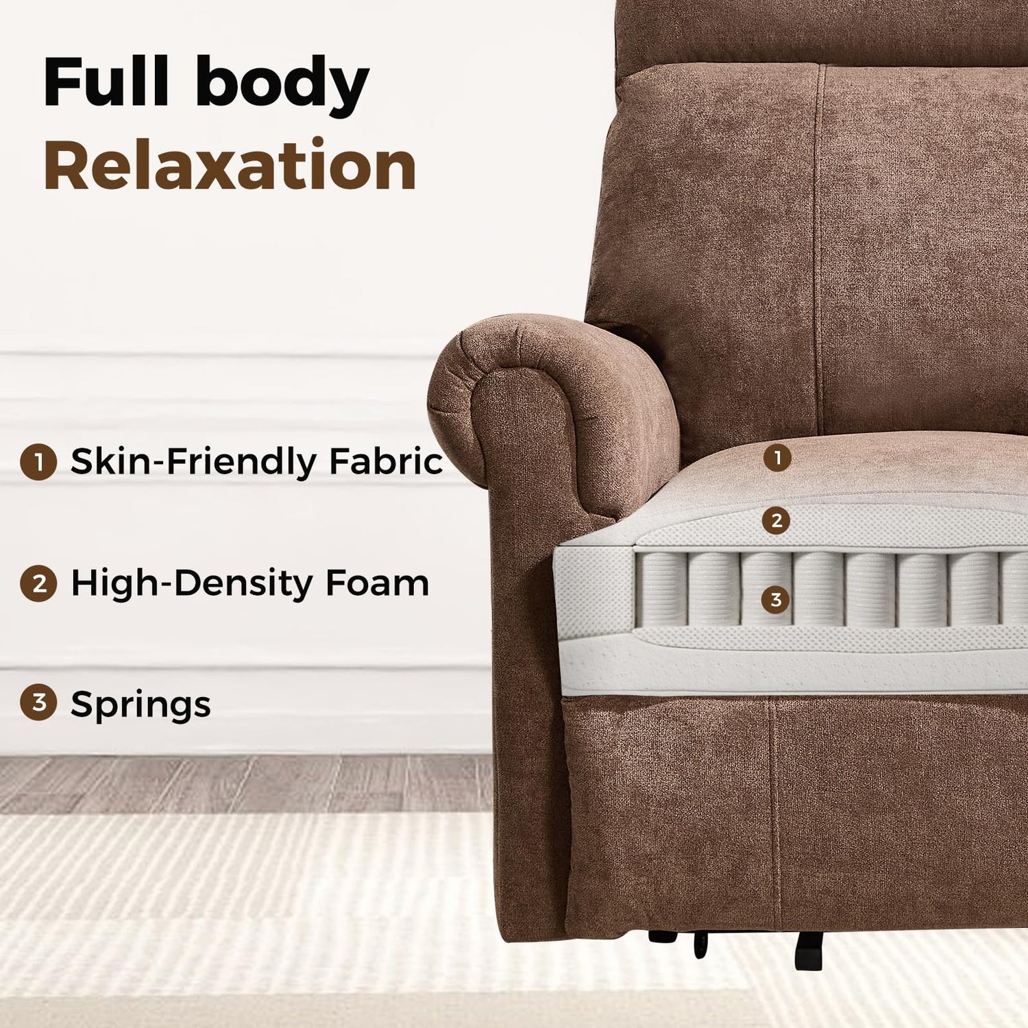 - Electric Recliners With premium fabric: Crafted with breathable fabric, this power recliner chair combines luxurious texture with Softness and durability, and the recliner is filled with high-density sponge, which makes the headrest, lumbar support, and armrests soft and comfortable for reading, watching TV, or taking a nap