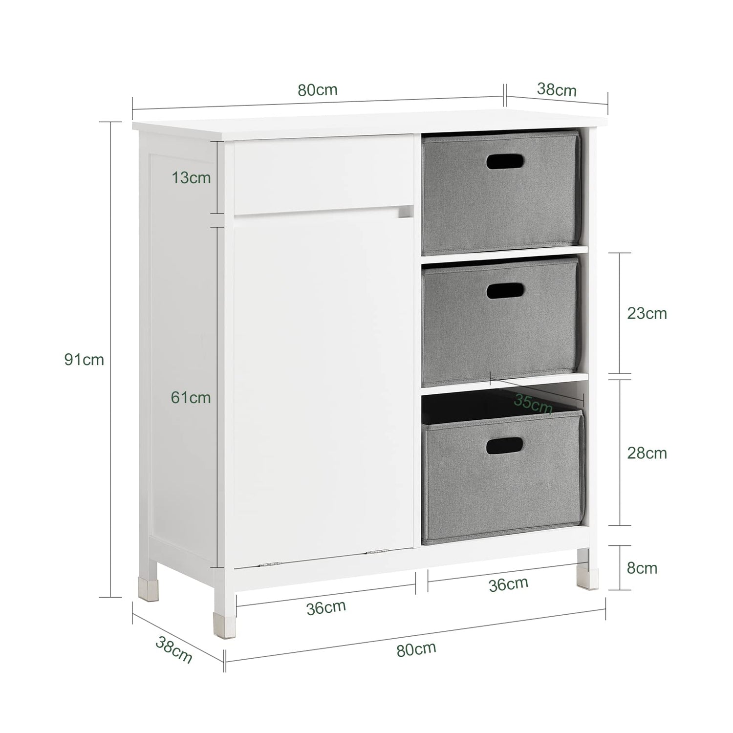 - [Modern Style Laundry Chest]: This laundry cabinet has 4 removable baskets. Modern design bathroom cabinet features a drawer, 3 fabric baskets and a cupboard with concealed laundry basket.