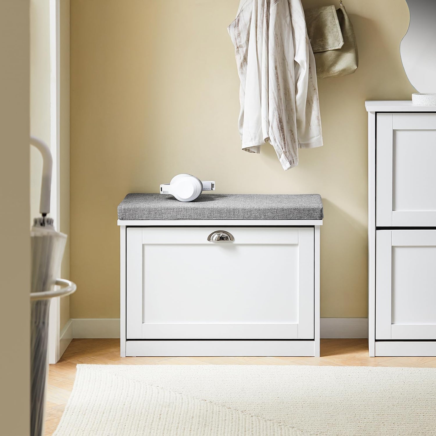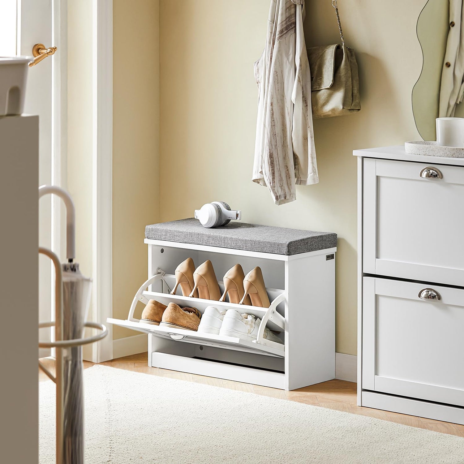 Haotian Small Shoe Storage Bench with Cushion, White Narrow Shoe Rack for Entryway, Small Shoe Cabinet with 2 Tiers Flip-Drawer, FSR195-K-W