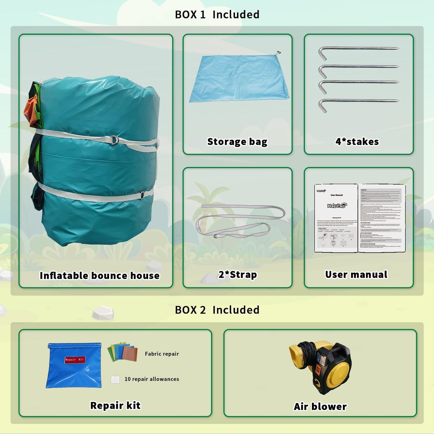 - 【Blower Included】Two packages,shipped separately.Perhaps you will receive the bounce house first or the air blower first. The 1.0 HP air blower is packaged together with repair kits(Box 2).The commercial bounce castle is packaged together with steel anchor stakes,storage bag and user manual (Box 1).Please be patient and wait.