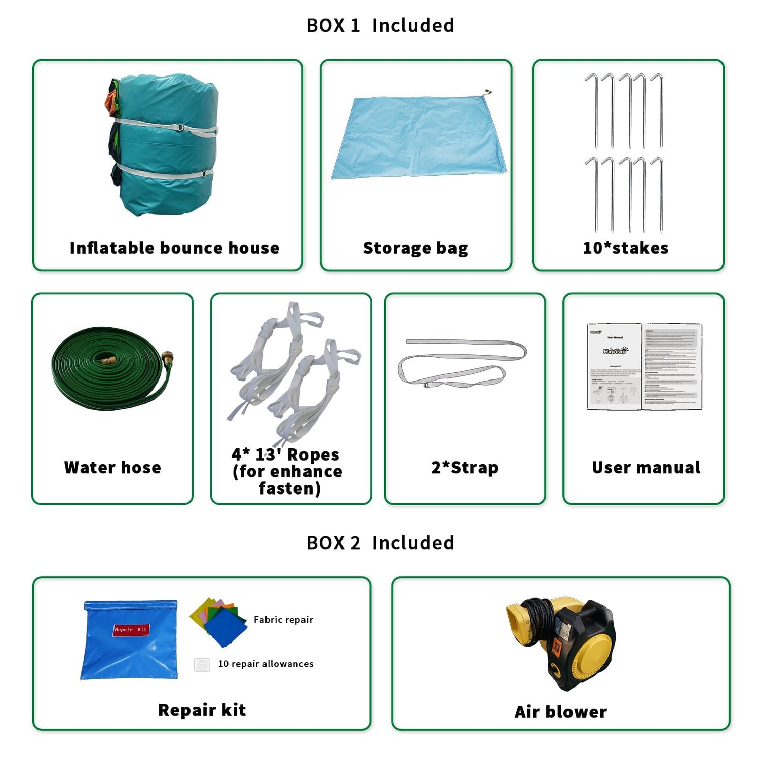 - 【With Air Blower】Two packages,shipped separately.Perhaps you will receive the water slide first or the air blower first. The 1 HP air blower is packaged together with repair kits(Box 2).The water slide is packaged together with water hose,stakes,storage bag,ropes and user manual (Box 1).Please be patient and wait.