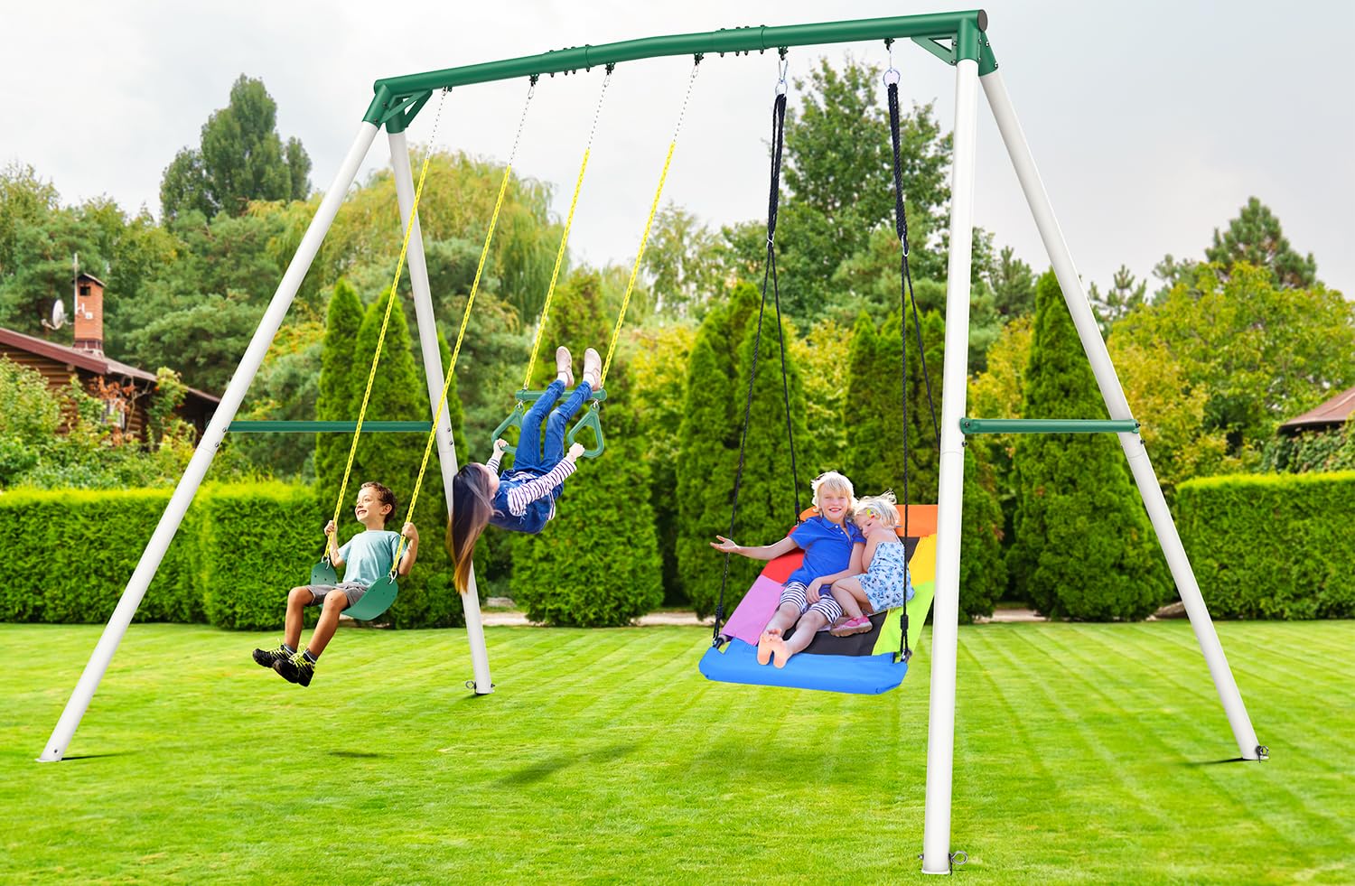 - 【3 Swing Options】Combine a social rectangle swing, a challenging trapeze swing bar, and a gentle belt swing with the tall swing frame. This setup offers diverse entertainment options and can accommodate multiple kids at the same time, ensuring everyone has a blast