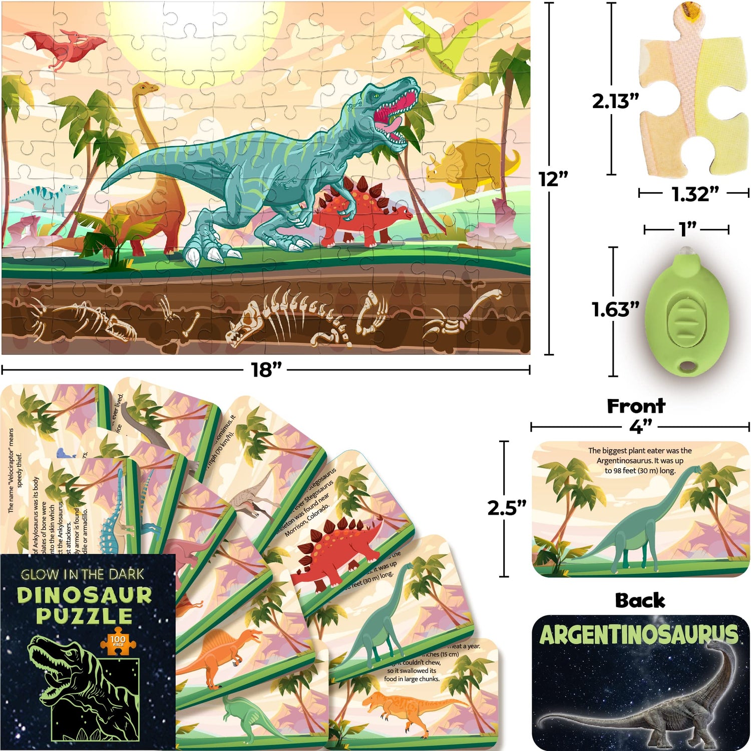 - FUN & EDUCATIONAL DINOSAUR PUZZLE FOR KIDS: This glow in the dark dinosaur jigsaw puzzle helps kids learn and develop important skills. Featuring 100 pieces, the puzzle encourages hand-eye coordination, problem-solving, and a love for prehistoric animals with fun dinosaur fact cards.