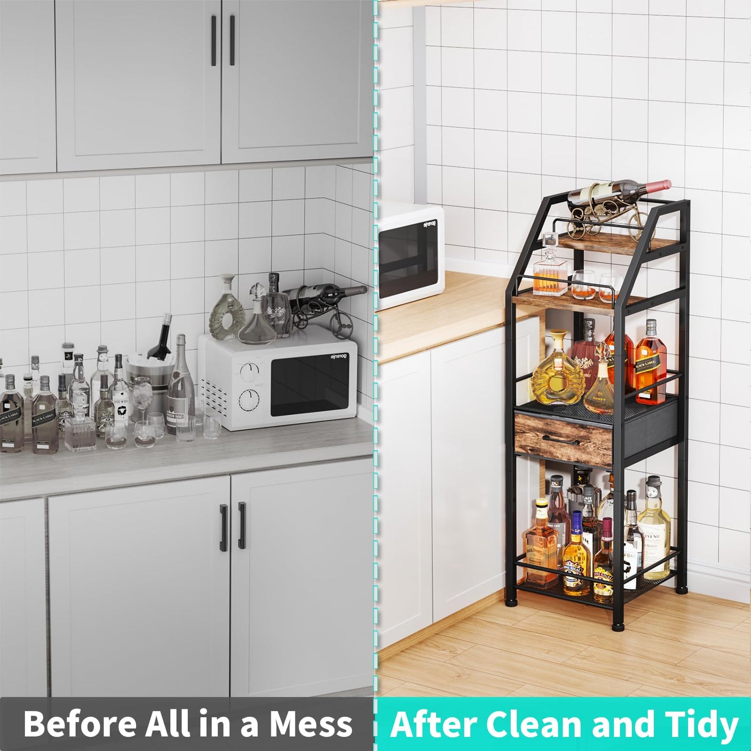 - [Spacious Multi-Tier Storage]: Designed with multiple tiers, this freestanding wine rack provides ample space for organizing your wine bottles, liquor, and glasses. Perfect for home bars, kitchens, living rooms, and more, it ensures your space remains tidy