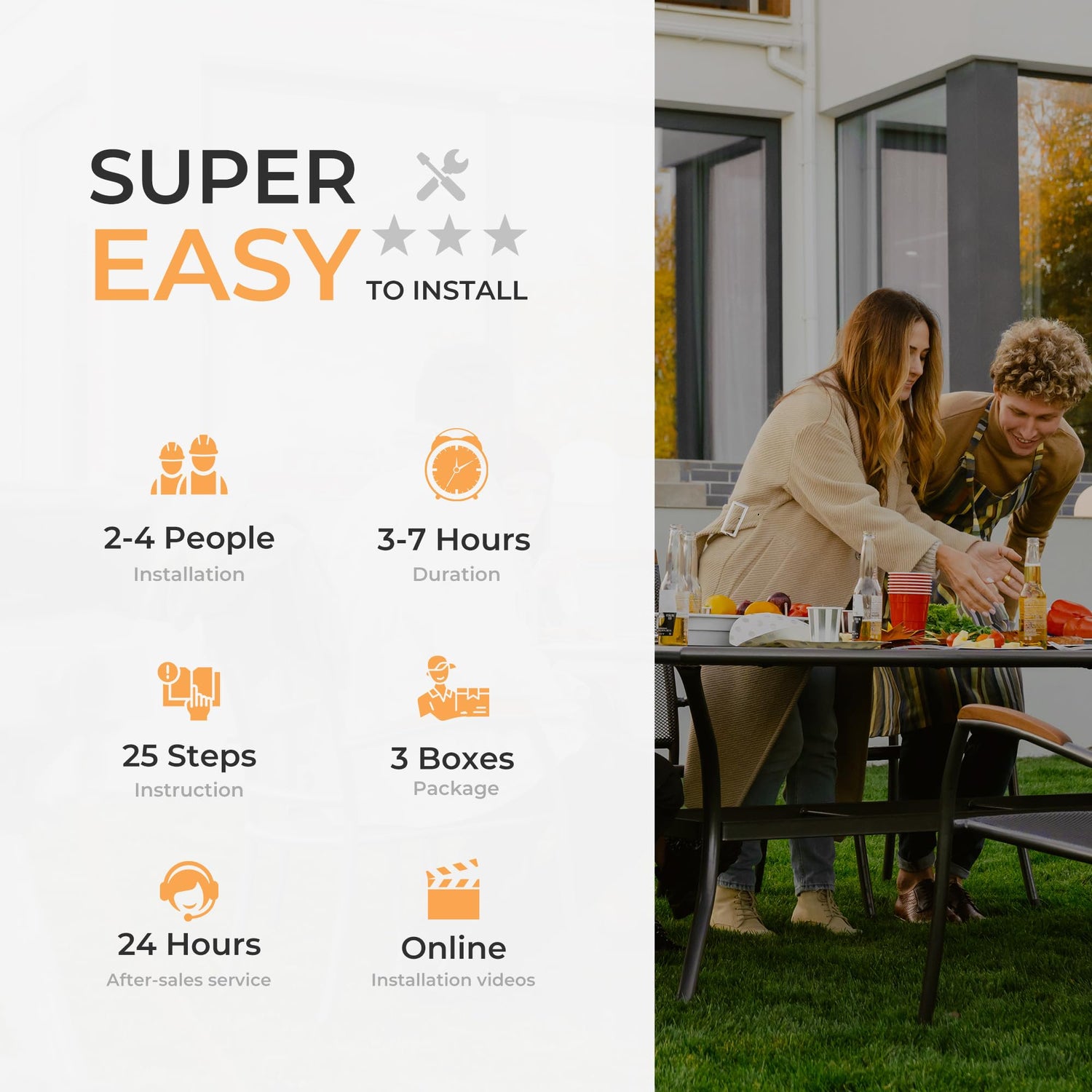 - Netting and Curtains: Our permanent hardtop gazebos feature a dual-slide design with zippered double side walls to enhance your outdoor experience. Double side walls not only protect you from the elements such as sun, rain, snow, etc., but they also enhance privacy.