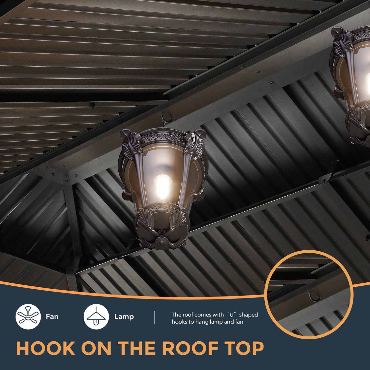 - Double Top and Hook Design: This hardtop gazebo is made of durable aluminum and features a double-tiered roof design that provides extra stability and allows for improved air flow. The gazebo also comes with built-in hooks, making it easy to hang plants, lights, or other decorations.