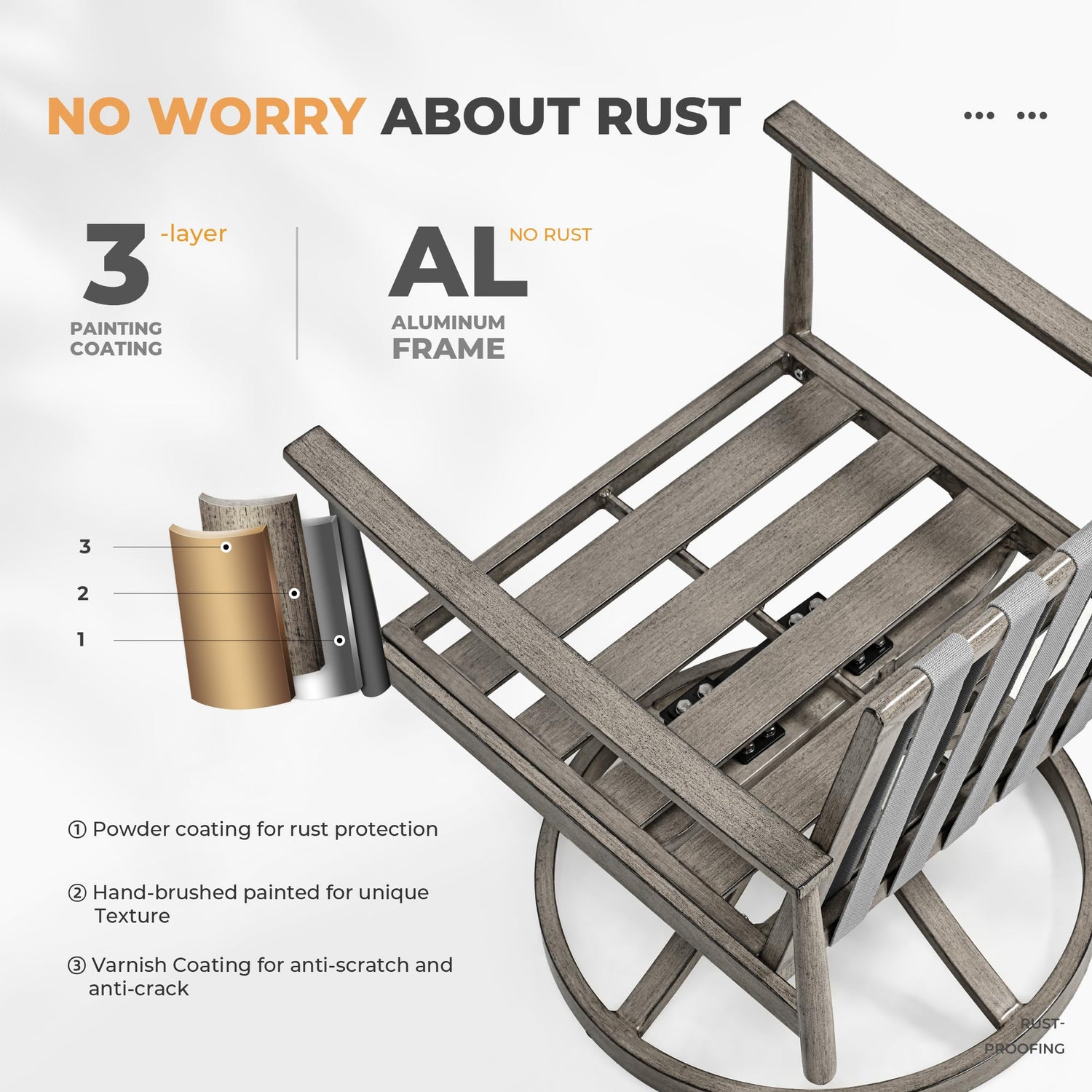 - Powder-Coated Aluminum Frame: Our outdoor patio dining set boasts an all-aluminum frame that is incredibly durable with its powder-coated surface. The combination of these features guarantees maximum stability and protection against rust and rain damage. Each chair supports up to 250 LBS. Furthermore, the frame surfaces are meticulously hand-brushed by skilled craftsmen, creating a unique texture that adds an elegant touch to your dining area.