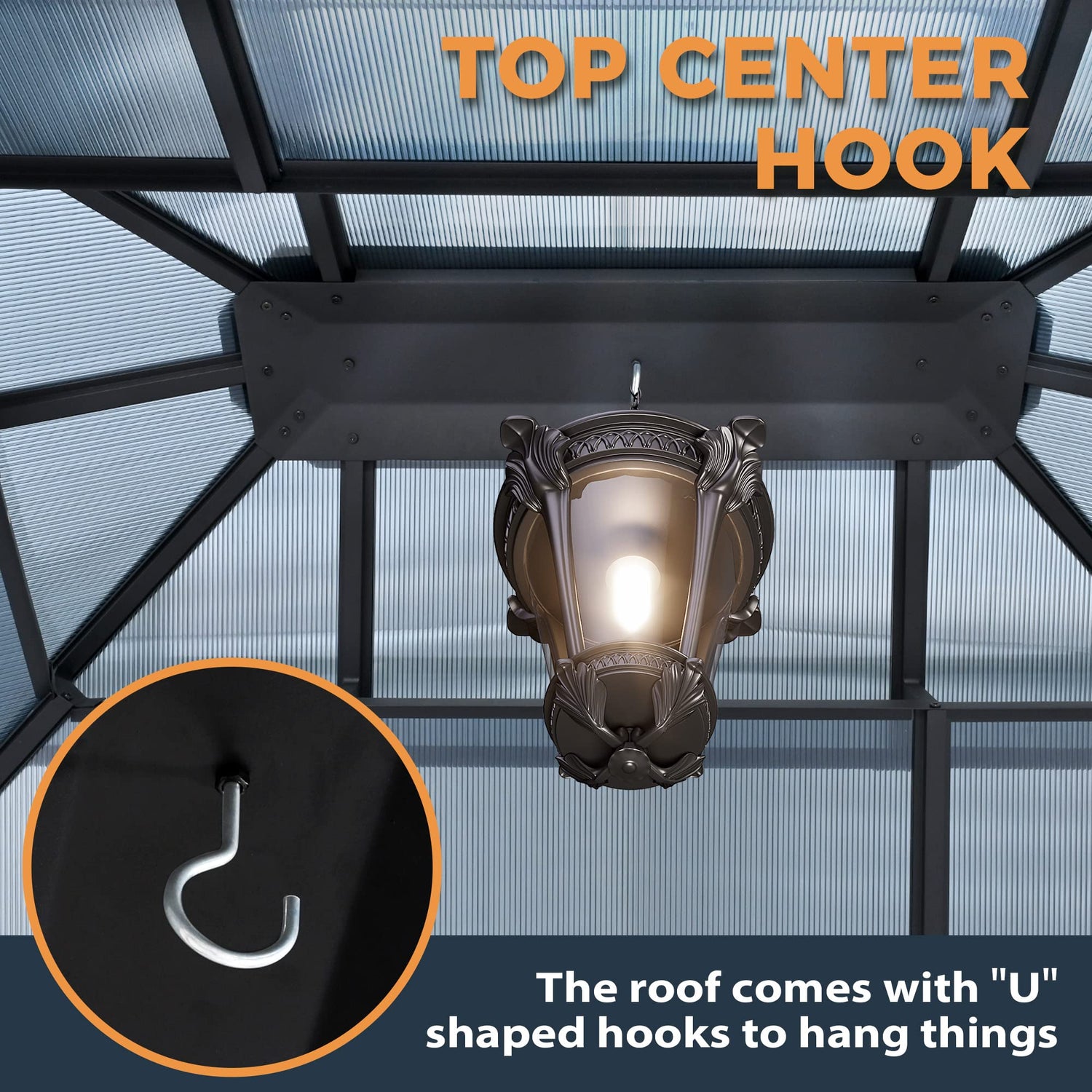 - Polycarbonate Top: Our hardtop gazebo has a double polycarbonate roof. Polycarbonate panels filter out 99% of UV proof. A double hard top allows airflow and adds stability to the gazebo. The panels are also fade resistant to make your outdoor recreation last longer.