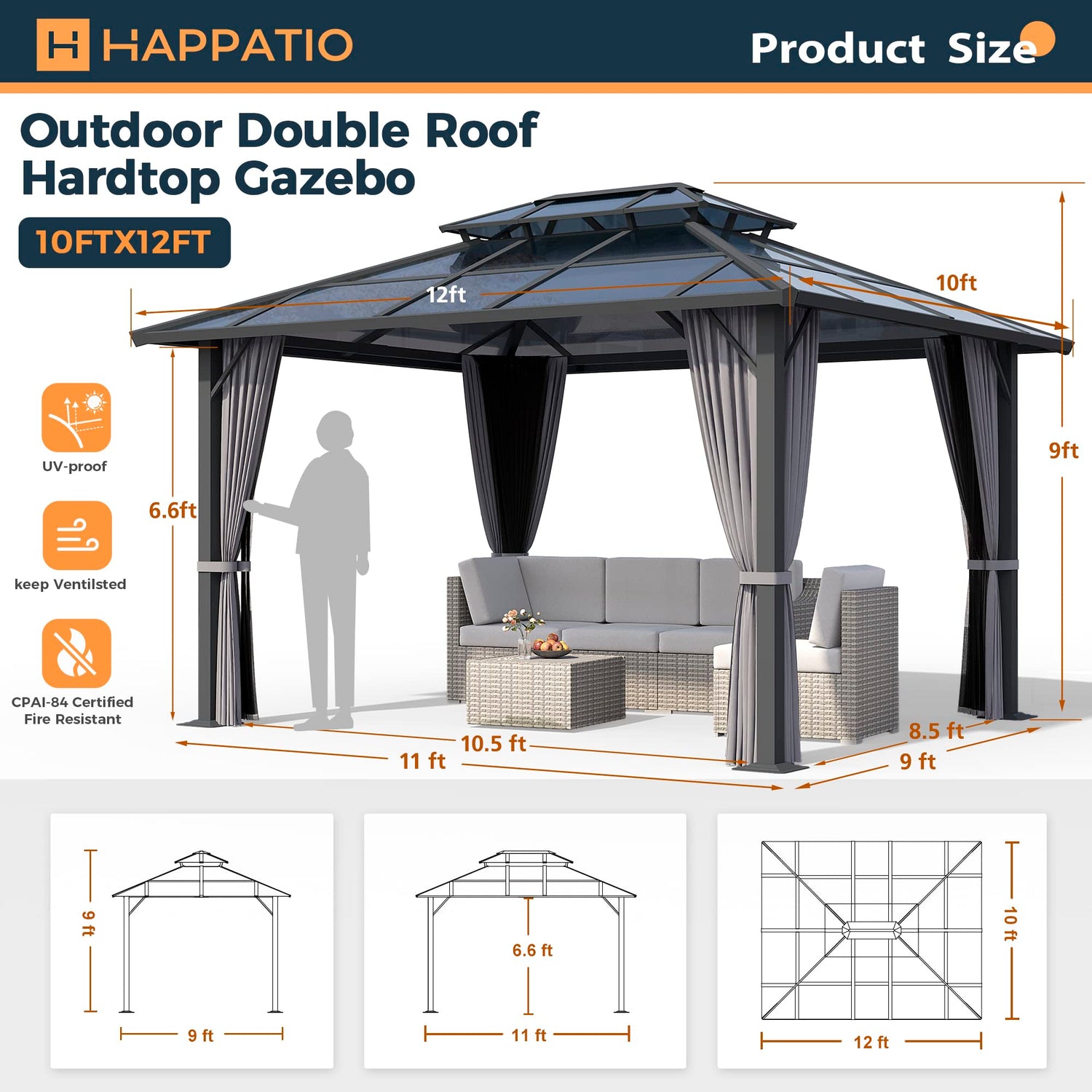 HAPPATIO Hardtop Gazebo, 10'x 12' Polycarbonate Double Roof Aluminum Furniture Gazebo, Outdoor Canopy with Netting and Curtains for Backyard, Patio, Parties, Lawns (Gray)