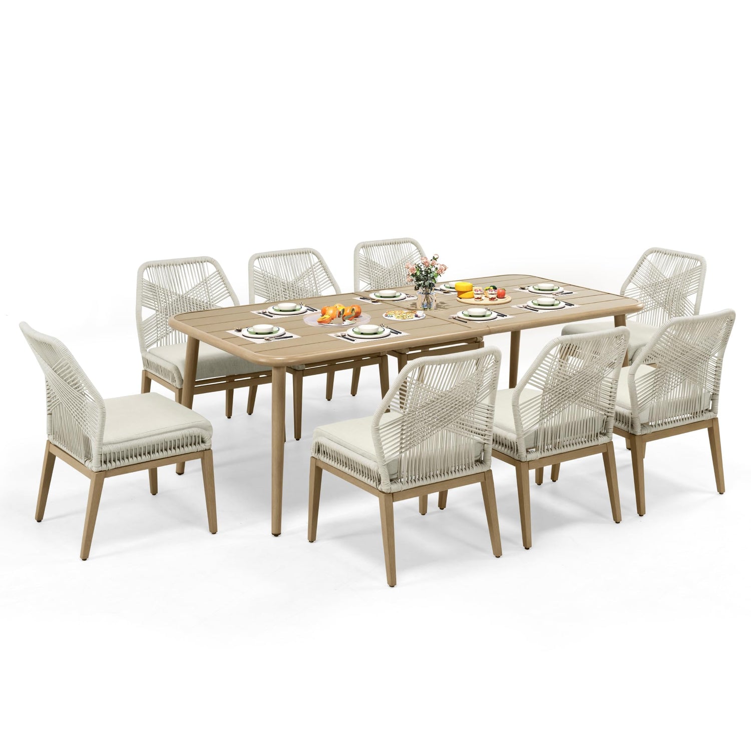 HAPPATIO Outdoor Dining Sets for 8, 9-Piece Patio Table and Chairs Set, Rope Woven Chairs with Cushions, Wood-Grain Aluminum Frame Patio Dining Set for Outside, Lawn, Garden, Backyard