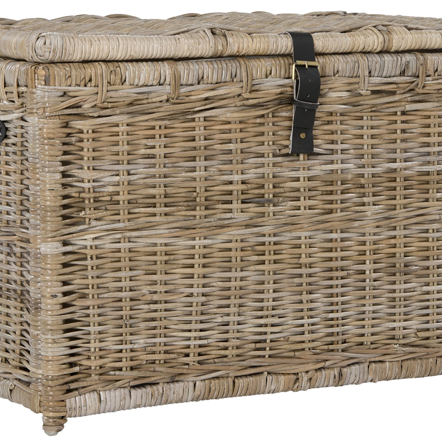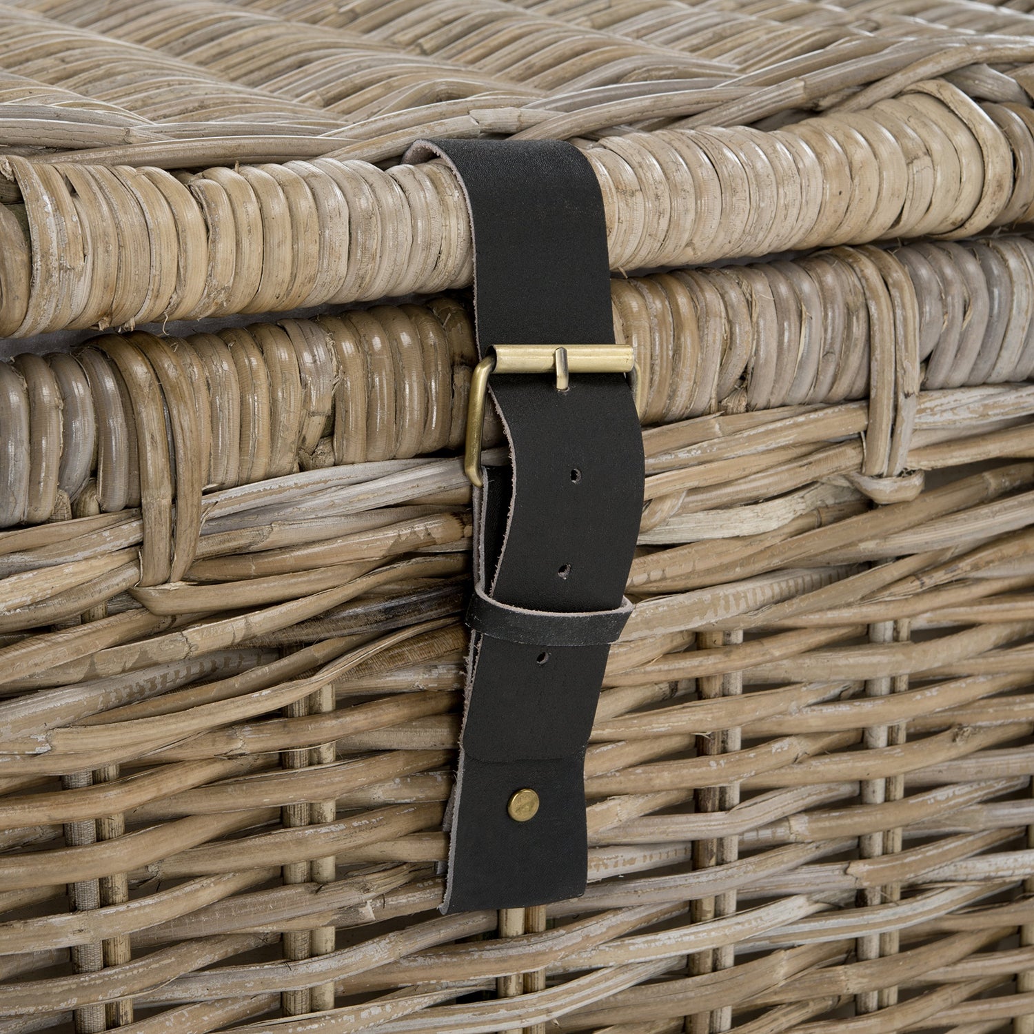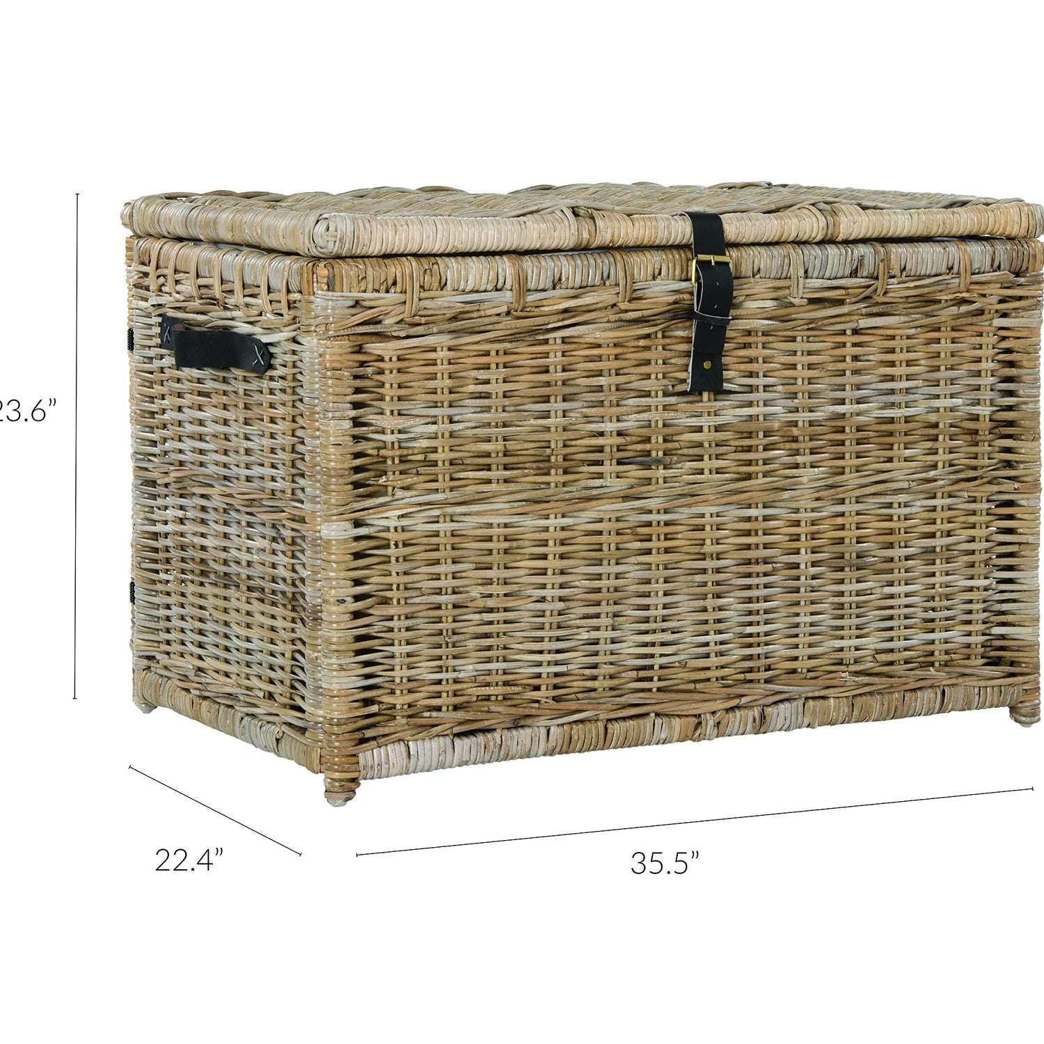 Details: The natural wicker weave and leather strap accent on this lidded trunk make it a beautiful addition to any space. In addition to adding style to a room, its functional lid and large capacity make it a valuable tool for hiding unwanted clutter from holiday decorations to laundry. Best of all, this versatile trunk folds flat for storage and is easy to assemble, so it can be tucked under a bed when not in use.