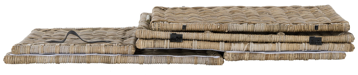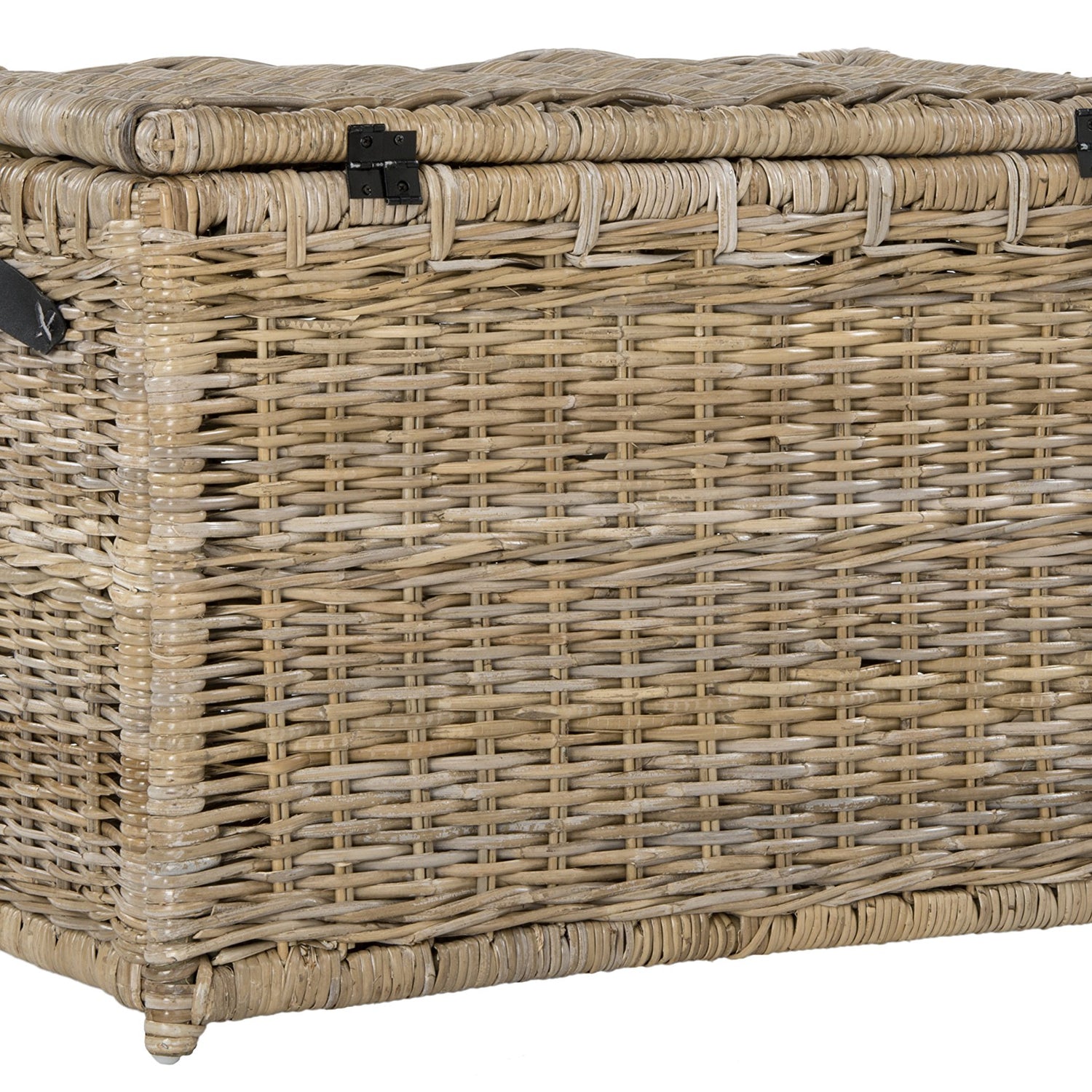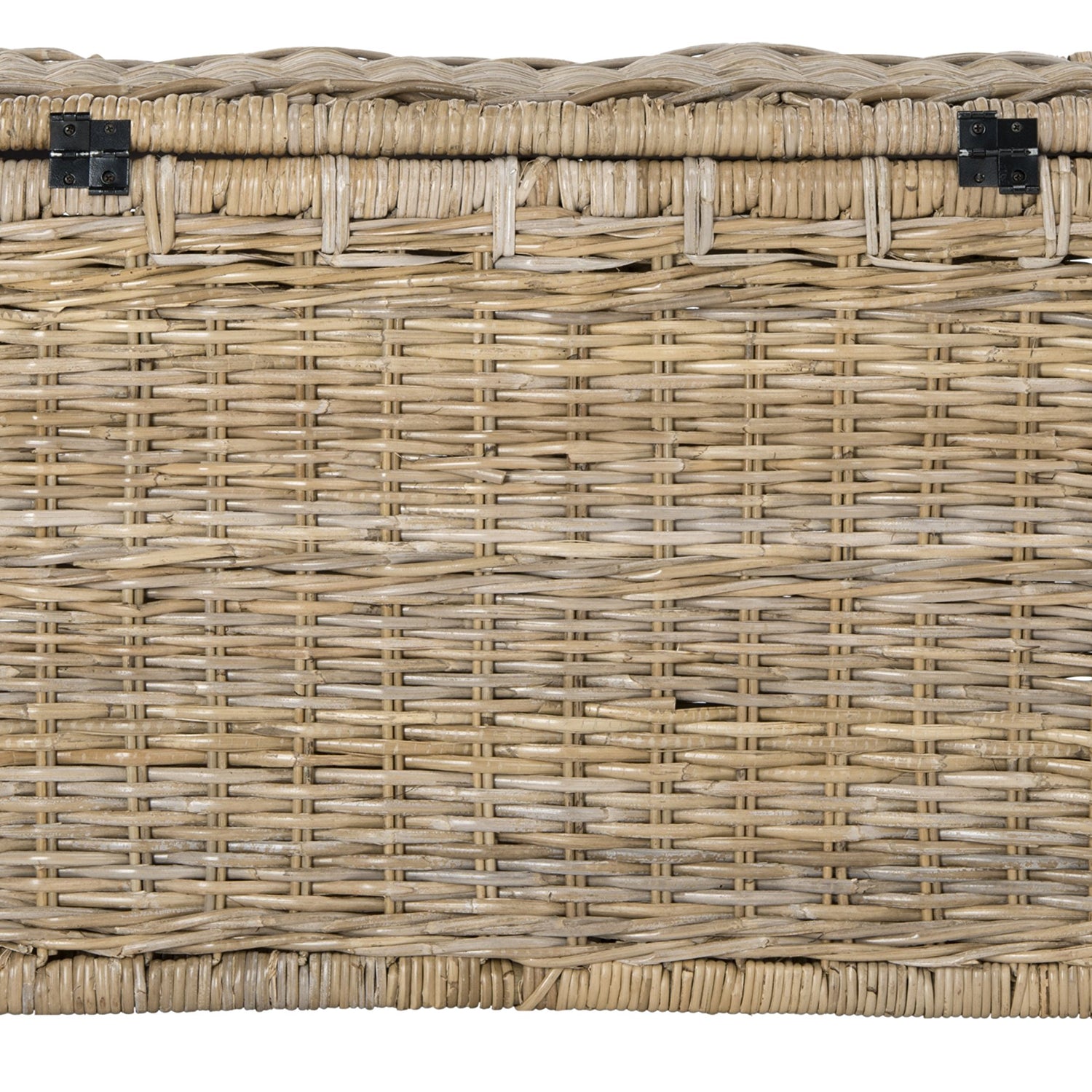 Details: The natural wicker weave and leather strap accent on this lidded trunk make it a beautiful addition to any space. In addition to adding style to a room, its functional lid and large capacity make it a valuable tool for hiding unwanted clutter from holiday decorations to laundry. Best of all, this versatile trunk folds flat for storage and is easy to assemble, so it can be tucked under a bed when not in use.