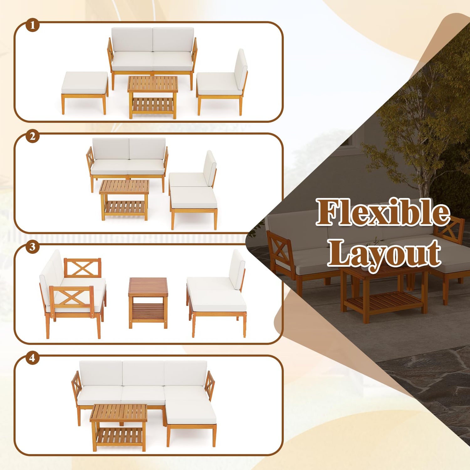 The modular design, consisting of a coffee table, right arm sofa, left arm sofa, armless sofa and ottoman, allows for flexible arrangement, catering to different spaces and needs. Each piece in this outdoor patio set is crafted from long-lasting acacia wood, known for its stability, ensuring it endures through seasons of use. Comfort isn't overlooked, with soft cushions featuring removable and washable covers that promise ease of maintenance and endless relaxation.