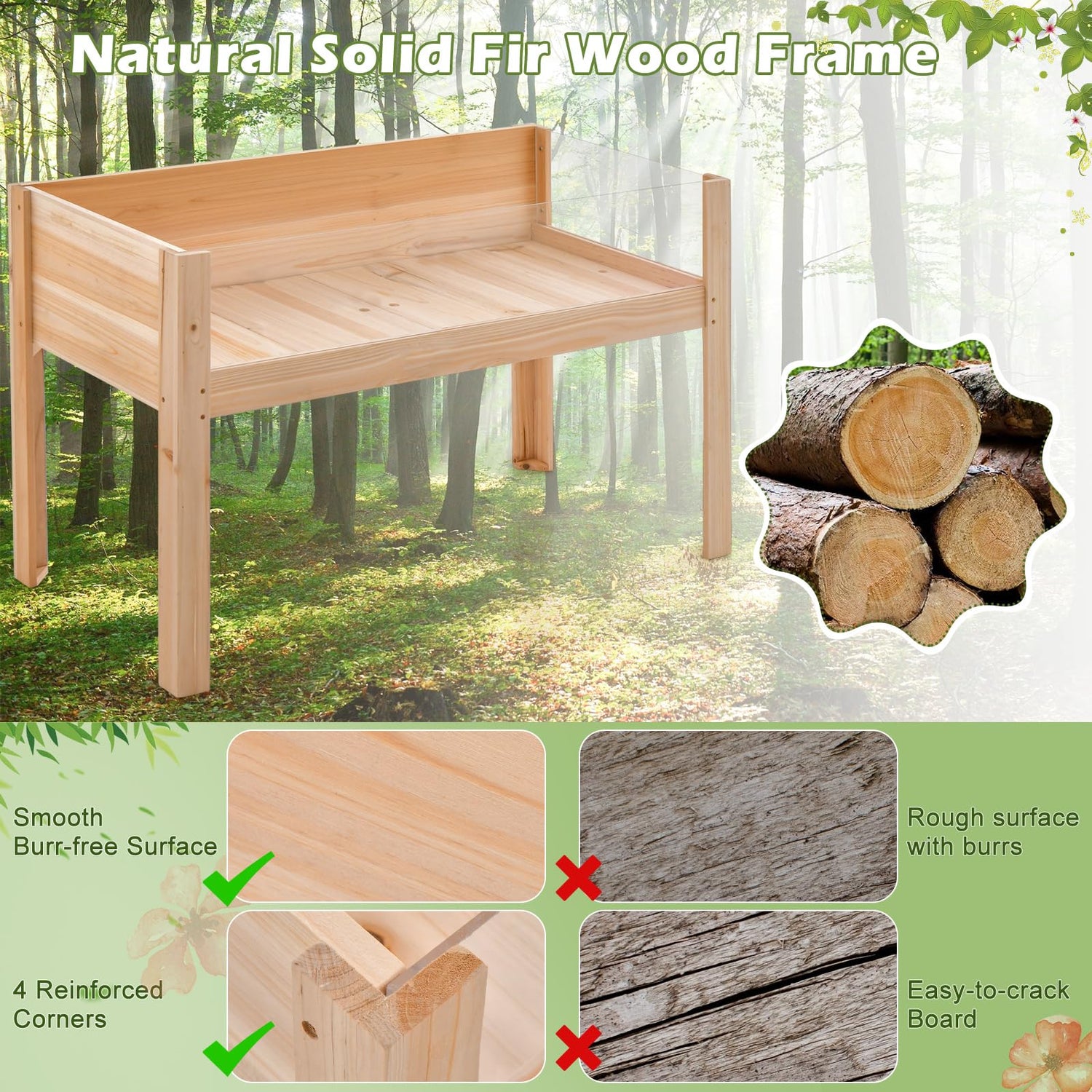 - 100% Solid Fir Wood Frame: Made of natural solid fir wood frame, the wooden raised planter withstands the test of time and weather. Unlike other easy-to-crack board with rough surface with burrs, ours features smooth burr-free surface and 4 reinforced corners for better quality.