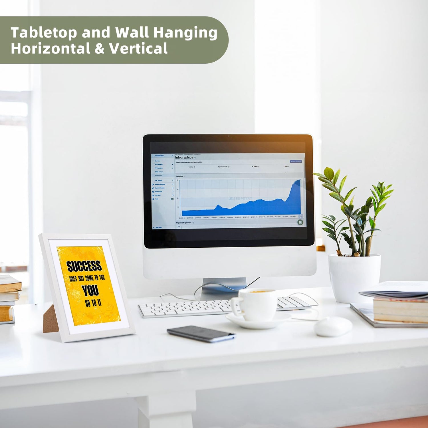 - Unique Design - The 8x10 picture frame white can display an 8" x 10" photo without Mat, or a 5" x 7" photo with Mat, which can layer your photo and enhances its appeal. With hooks and brackets, the frames can be displayed on desktop or on the wall, vertically or horizontally. Just put them wherever you want.