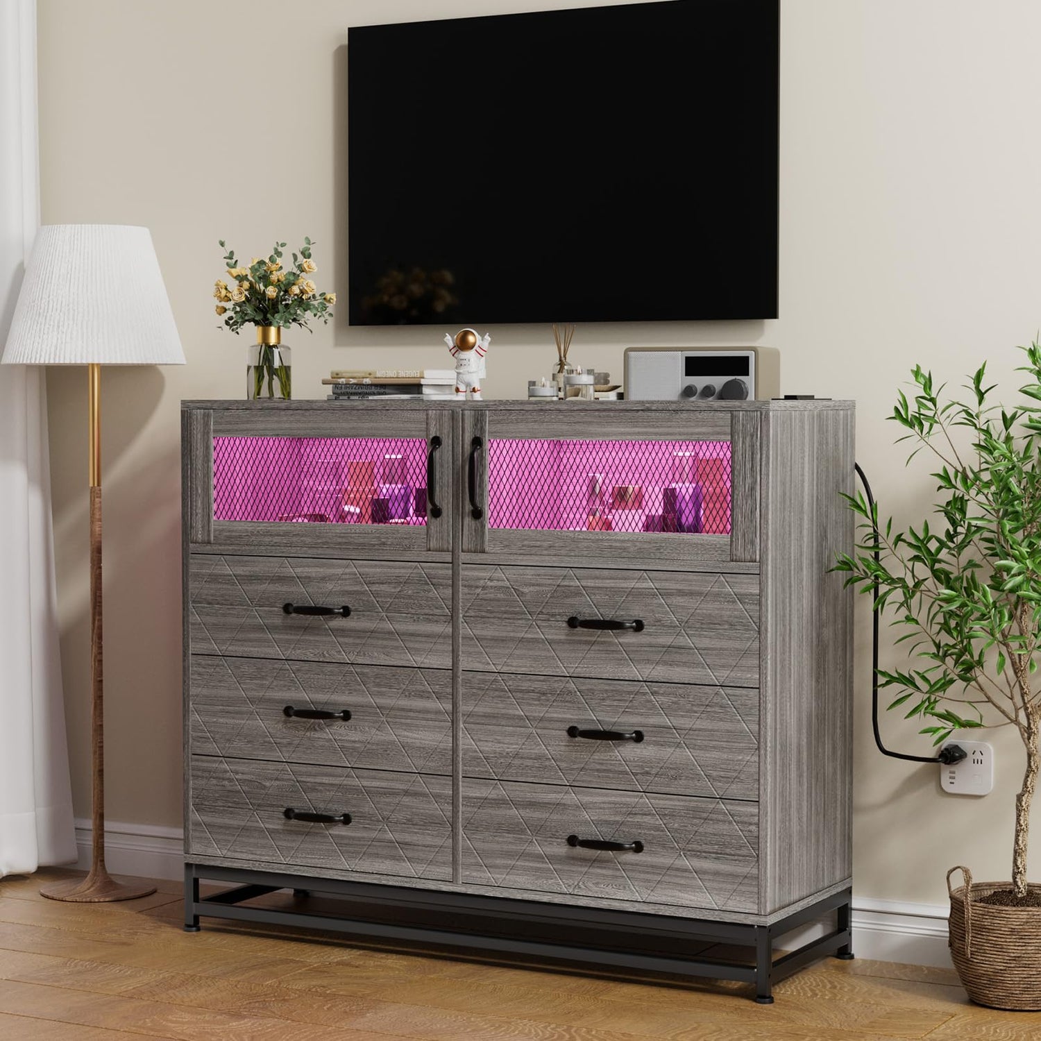 Harmobitat Dresser for Bedroom with LED Lights and Charging Station, Wooden 6 Drawer Double Dresser with 2 Doors, Modern Chest of Drawers for Bedroom, Entryway, Hallway, Grey
