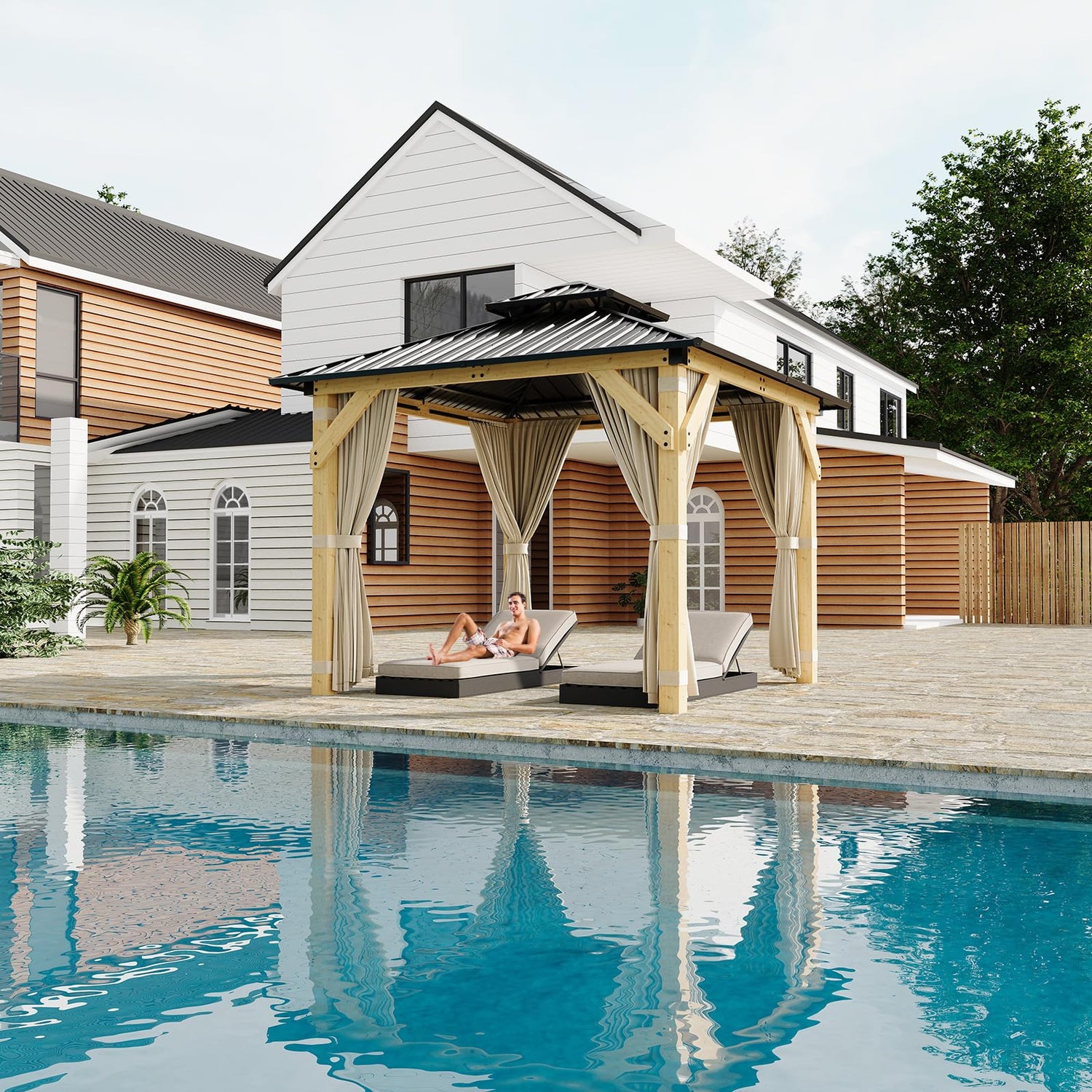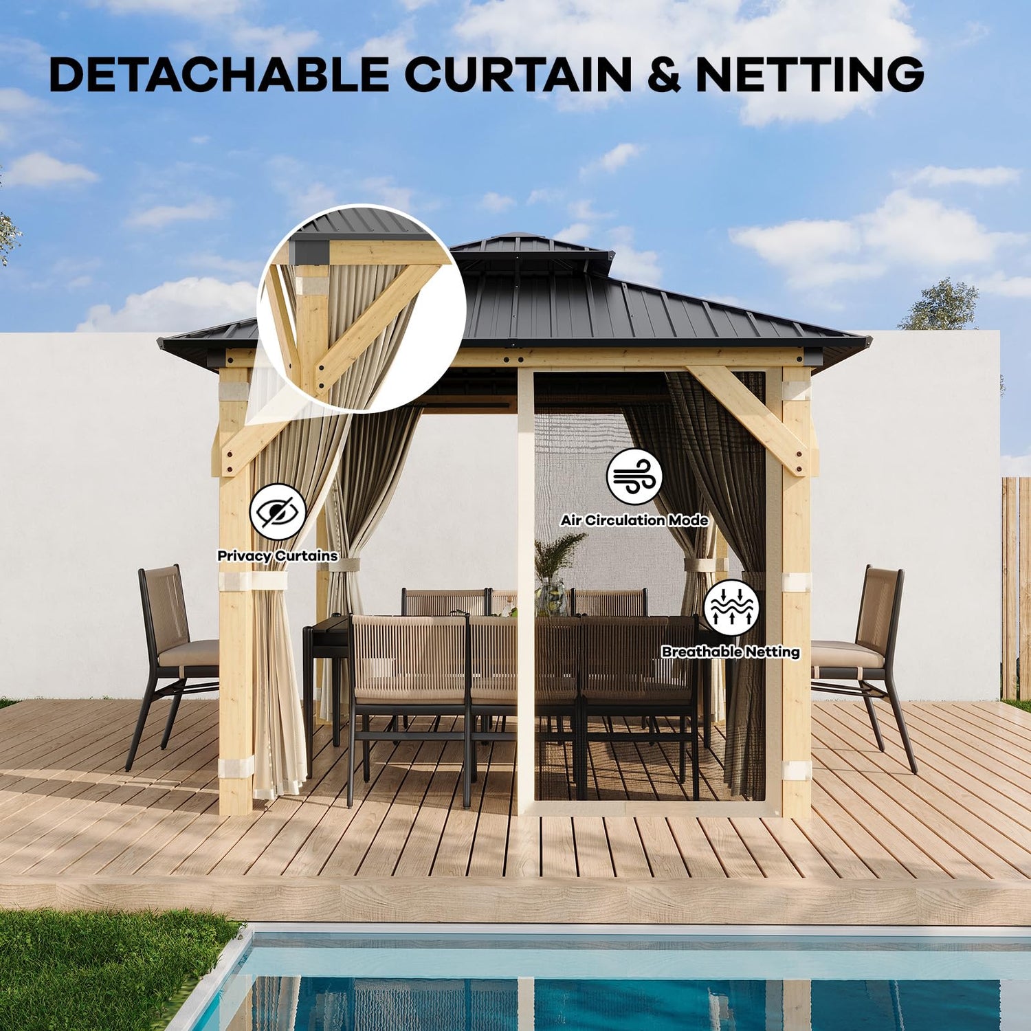 - ELEGANT COMBO: Both the wooden poles and alloy frame are covered with 3-layer anti-rust coating to withstand all weather conditions; the wooden poles integrate the pavilion with the wooden deck to increase the beauty.