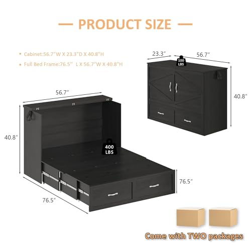Harpaq Full Size Murphy Bed, Full Size Cabinet Bed Frame with Storage Drawer, Farmhouse Wooden Cabinet for Bedroom/Office/Guest Room, Black+Barnwood