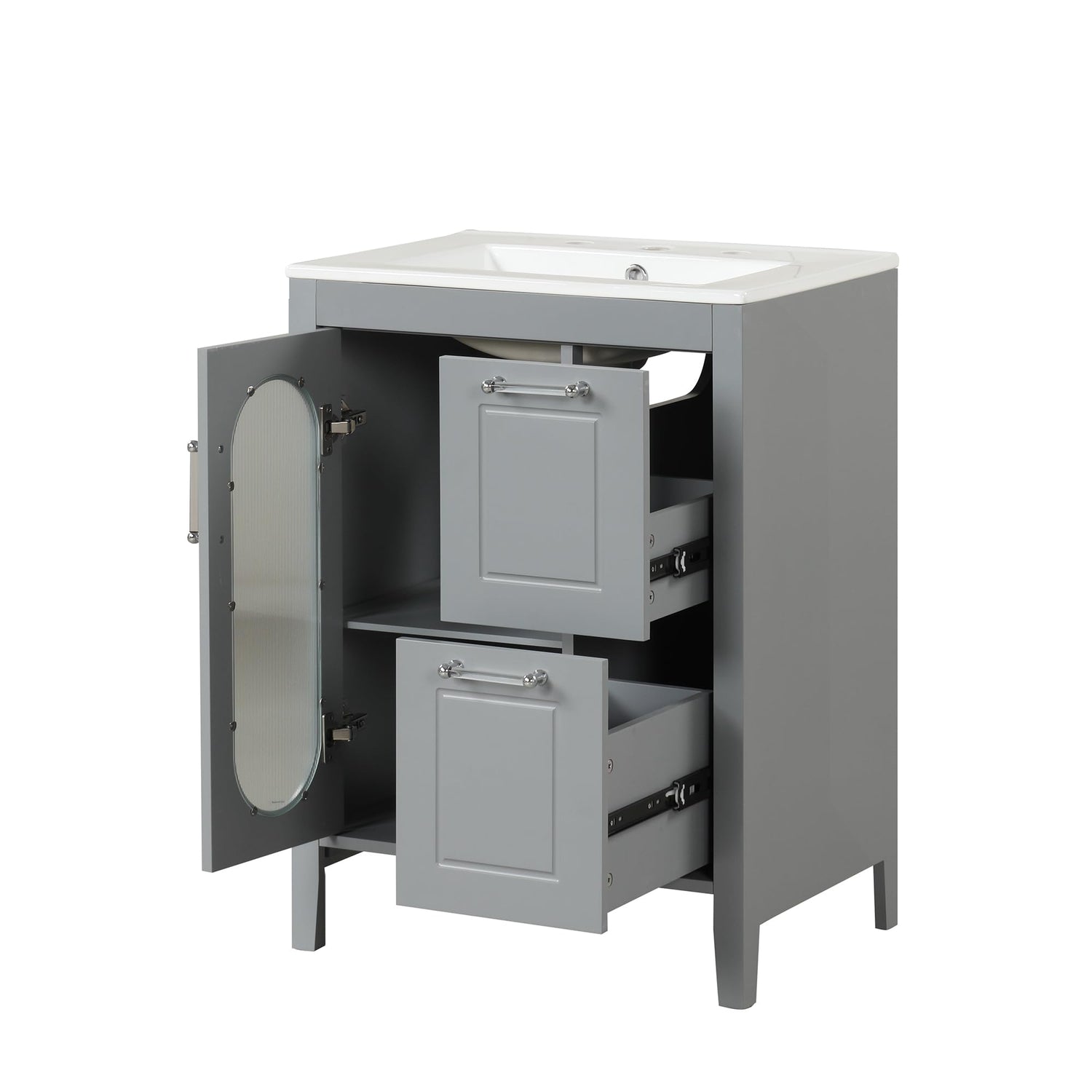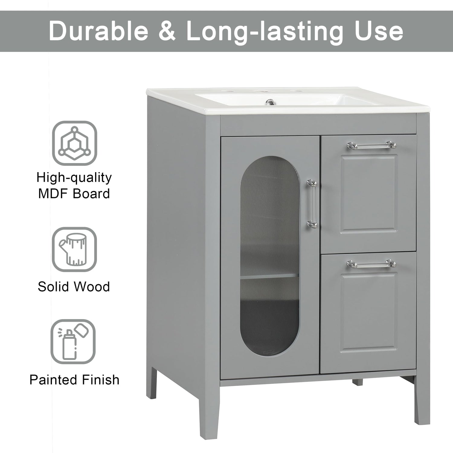 - 【Stylish 24" Bathroom Vanity】This 24" bathroom vanity cabinet is suitable for a bathroom in any decoration style. The freestanding vanity cabinet with silver handles complies with your bathroom facilities. Besides, the door is designed with moru glass, which has a hazy aesthetic feeling and adds elegant elements to your bathroom