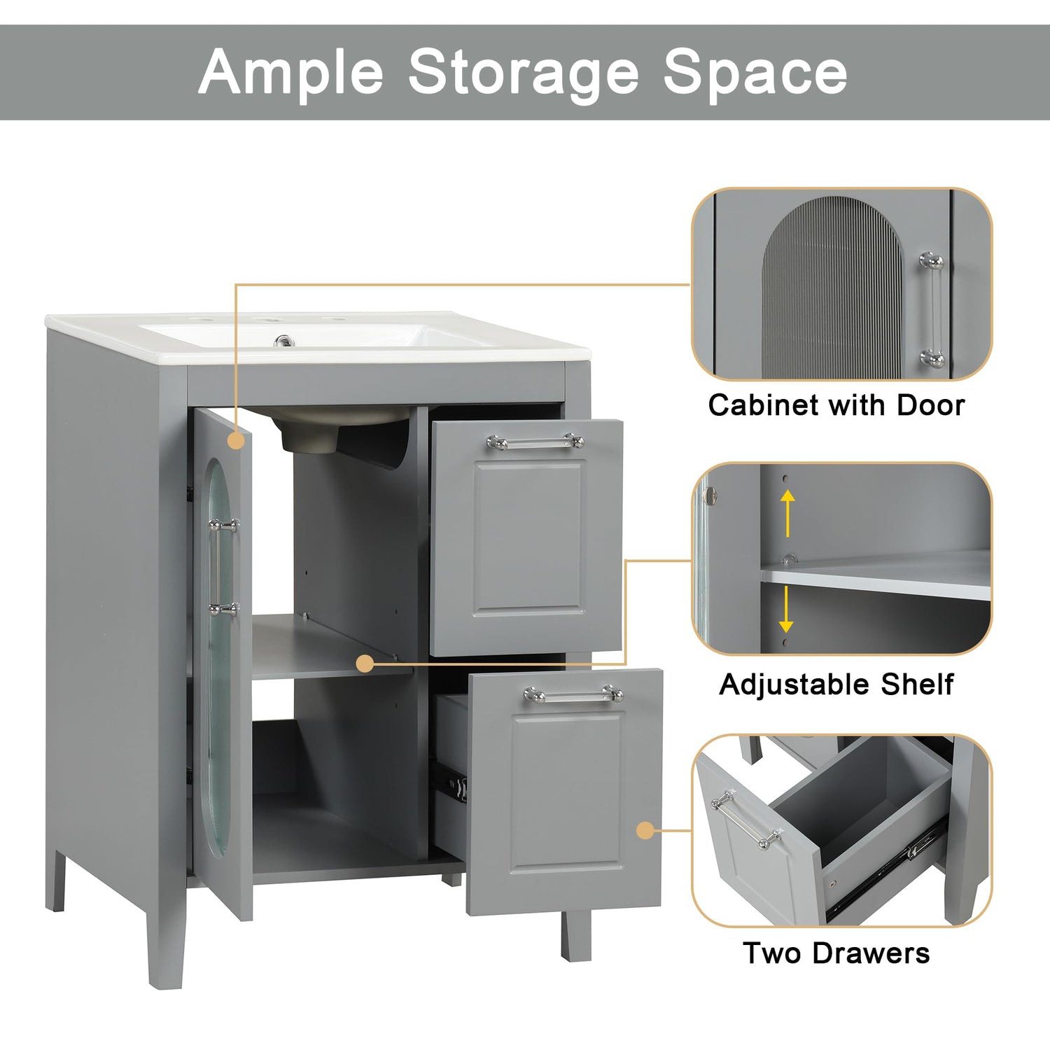 Harper & Bright Designs 24" Bathroom Vanity with Sink, Free Standing Single Basin Vanity Set with Two Drawers and Glass Door, Modern Wooden Bathroom Cabinet with Ceramic Basin for Bathroom, Grey
