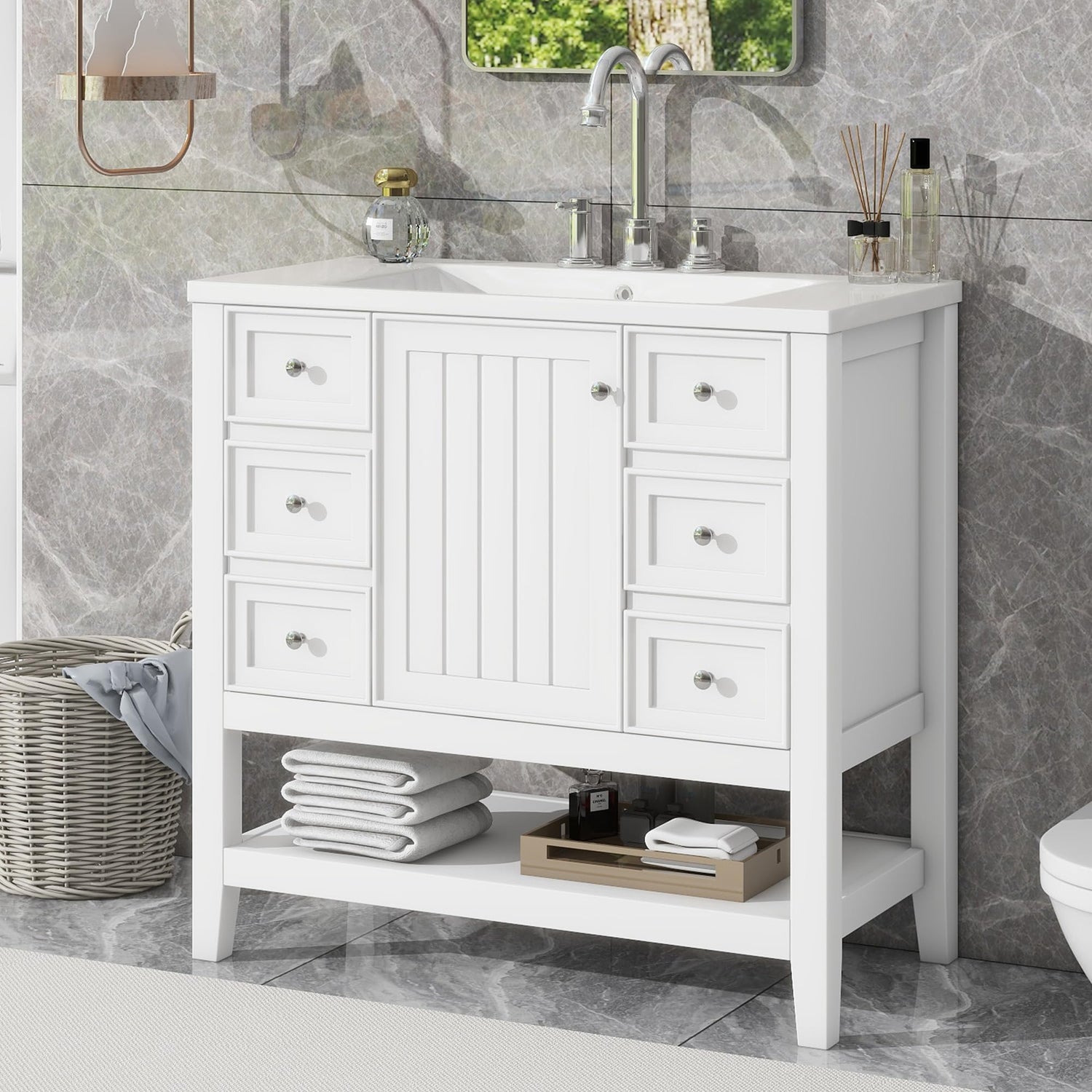 - 【Stylish 36" Bathroom Vanity】This 36" bathroom vanity cabinet is suitable for a bathroom in any decoration style. The minimalist appearance enhances the overall aesthetic appeal of your bathroom. The reasonable distribution of the whole furniture offers various functions to meet the different requirements in daily life.