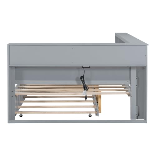 Harper & Bright Designs Full Daybed Frame with L-Shaped Bookcases, Wood Bed Frames with Trundle and USB Ports, Full Size Platform Bed with Storage Shelf and Charging Station for Kids Girls Boys, Grey