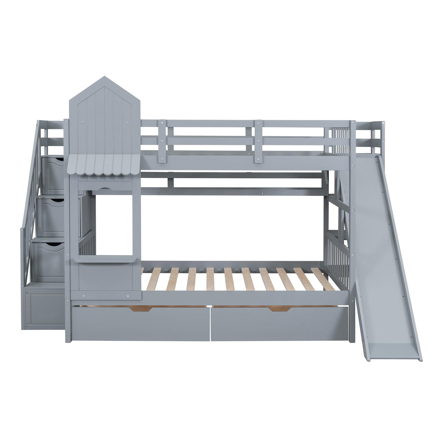 Harper & Bright Designs Full Over Full Bunk Bed with Slide and Stairs, Castle Style Bunk Beds with Storage Drawers and Shelves, Wooden Loft Bunk Bed Frame for Kids, Teens, Boys & Girls (Gray)