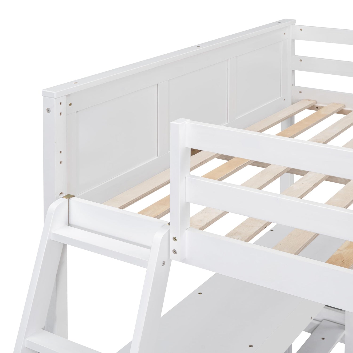 - 【High-Quality Wood Bunk Bed Frame】 Our multi-functional full over full size bunk bed is constructed from selected solid pine wood and MDF and iron alloy bolts which keeps the whole bed sturdy and wobble free. Slat system included, so no box spring needed. Guardrails are solidly attached for added safety.Weight Capacity: Upper bed:350 lbs Bottom bed:350 lbs.