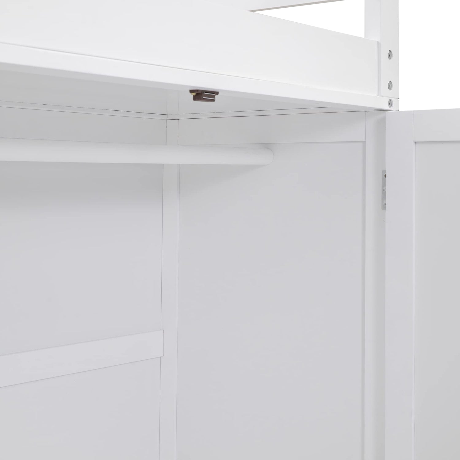 This loft bed features a robust wardrobe equipped with a convenient hanging pole, offering ample space to organise and stow away clothes. At the head of the bed, a small shelf is perfect for keeping essential items close by, ensuring a tidy and clutter-free environment.