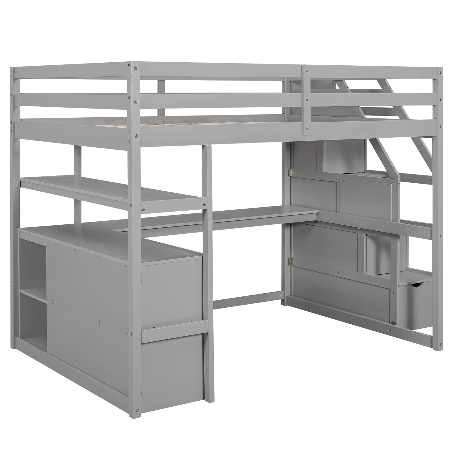 Grey Full Size Loft Bed with Stairs, Desk, Drawers, and Bookshelf by Harper & Bright Designs