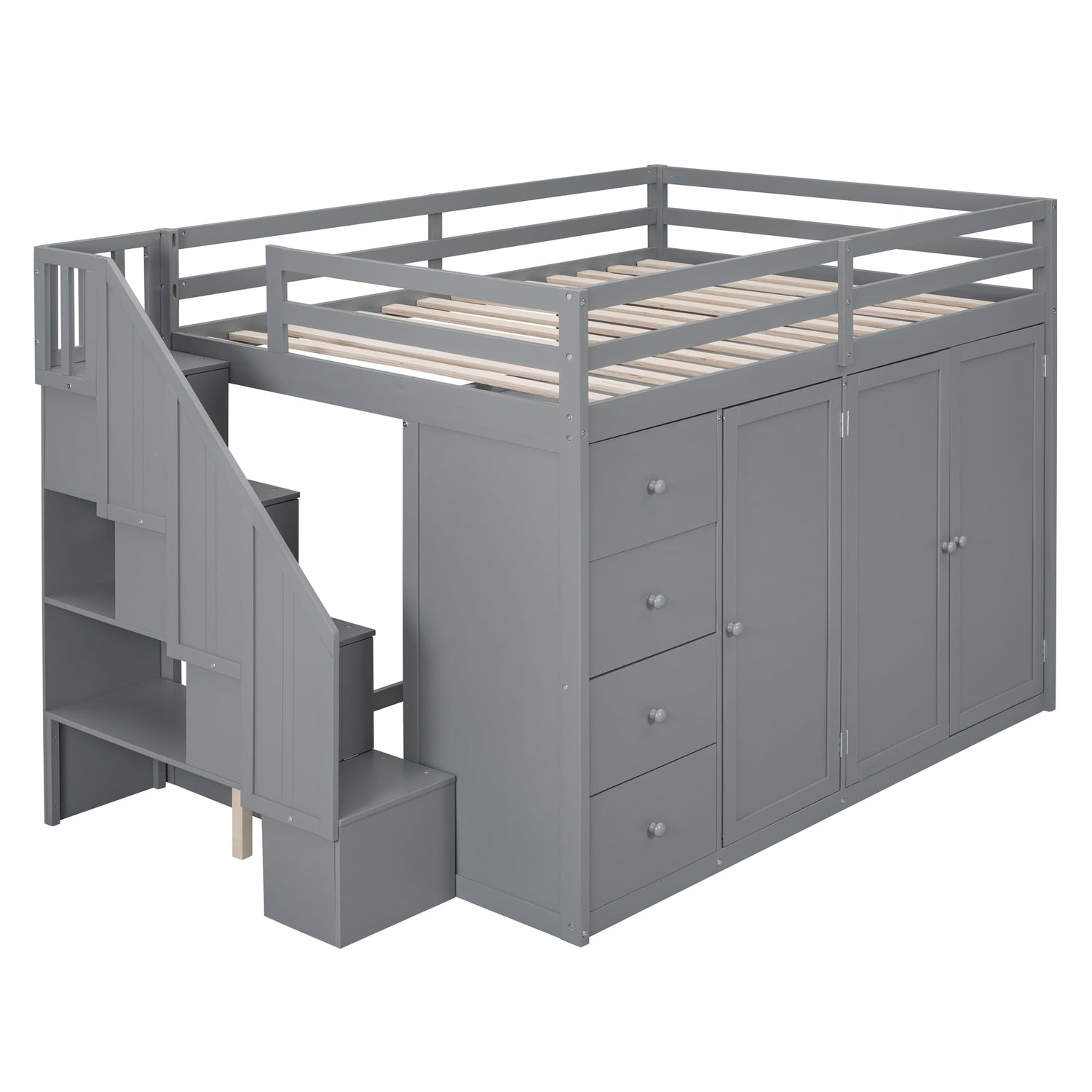 Harper & Bright Designs Grey Full Size Loft Bed with Storage Stairs and Wardrobes