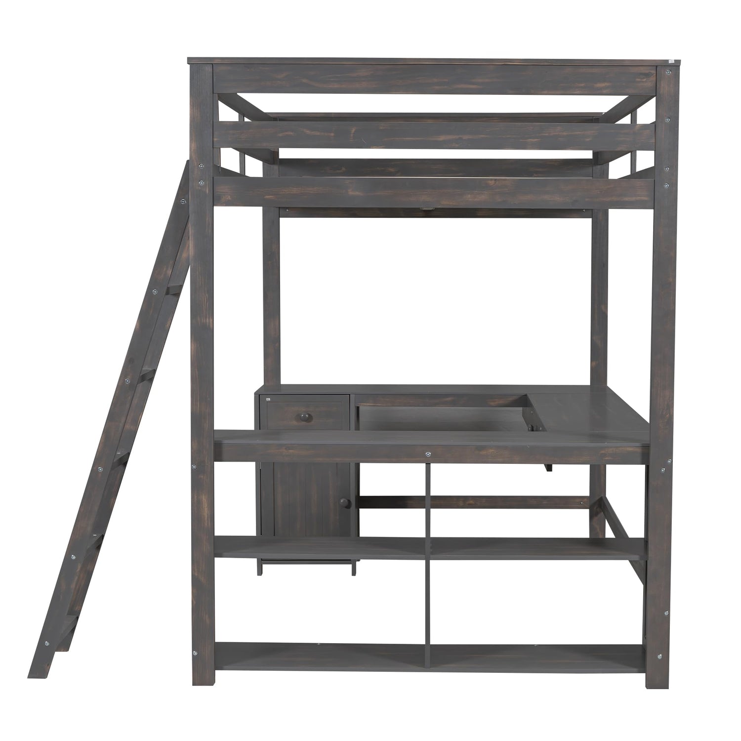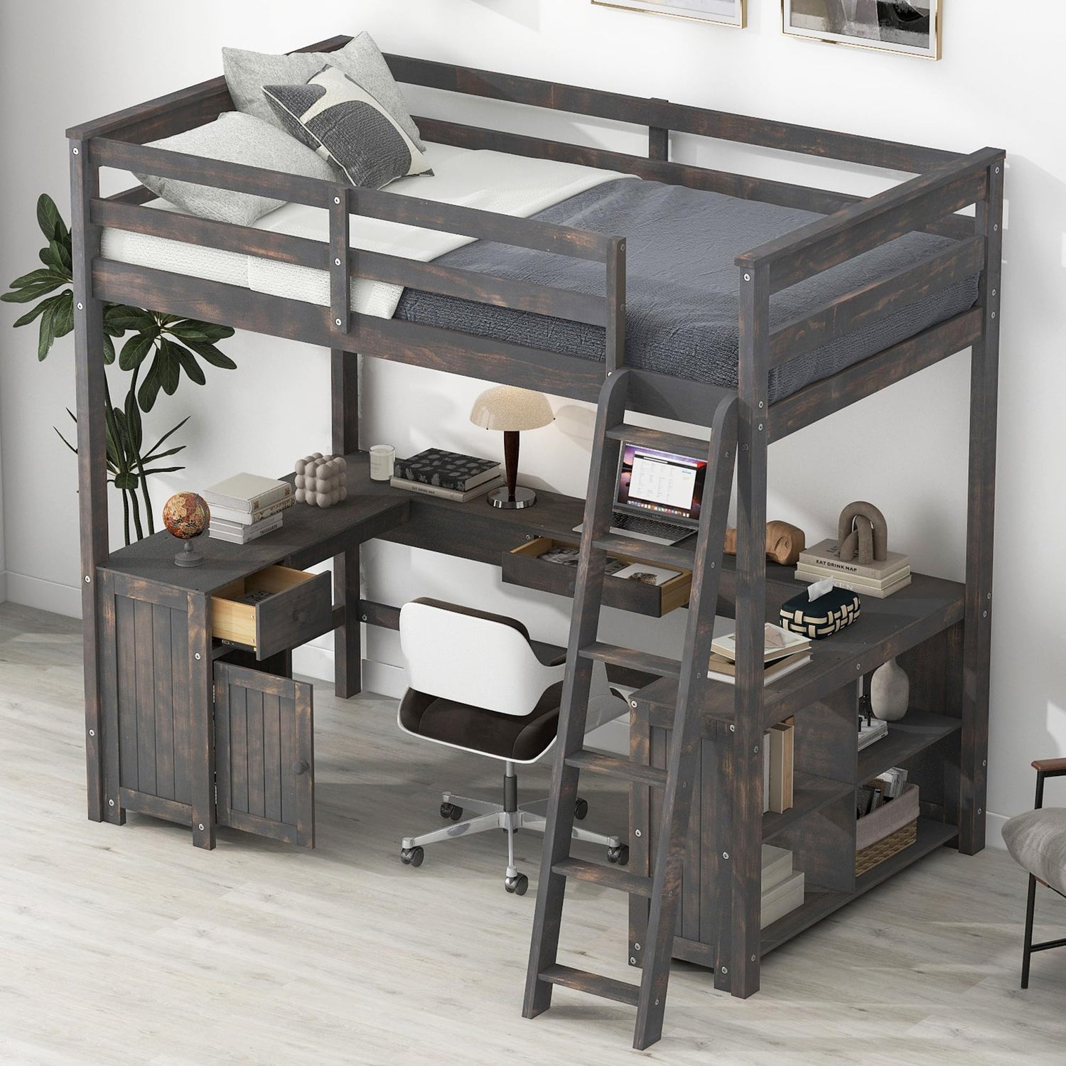 Harper & Bright Designs Antique Brown Full Size Loft Bed with U-Shaped Desk and Ample Storage