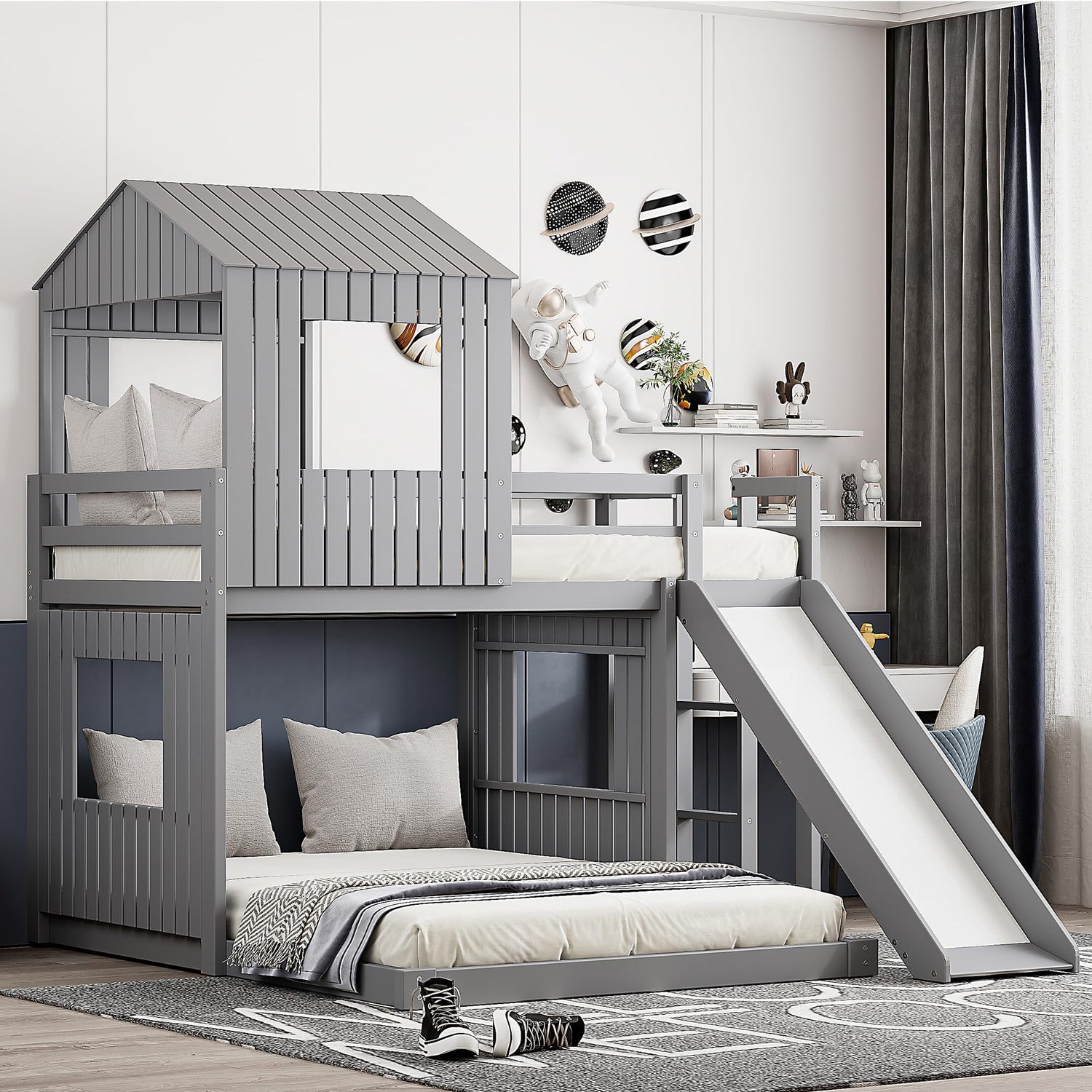 Harper & Bright Designs House Bunk Bed with Slide,Wood Twin Over Full Bunk Bed with Roof,Ladder & Safety Guardrail,Floor Bunk Loft Bed for Kids,Teens,No Box Spring Needed, Grey