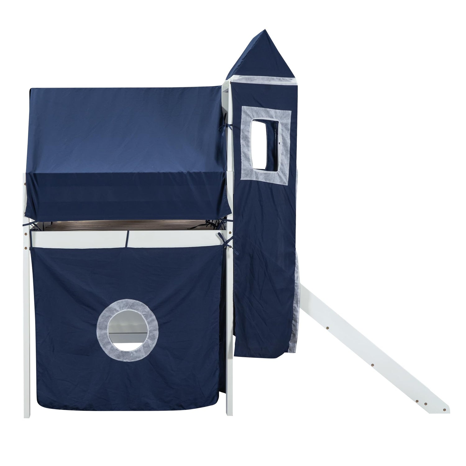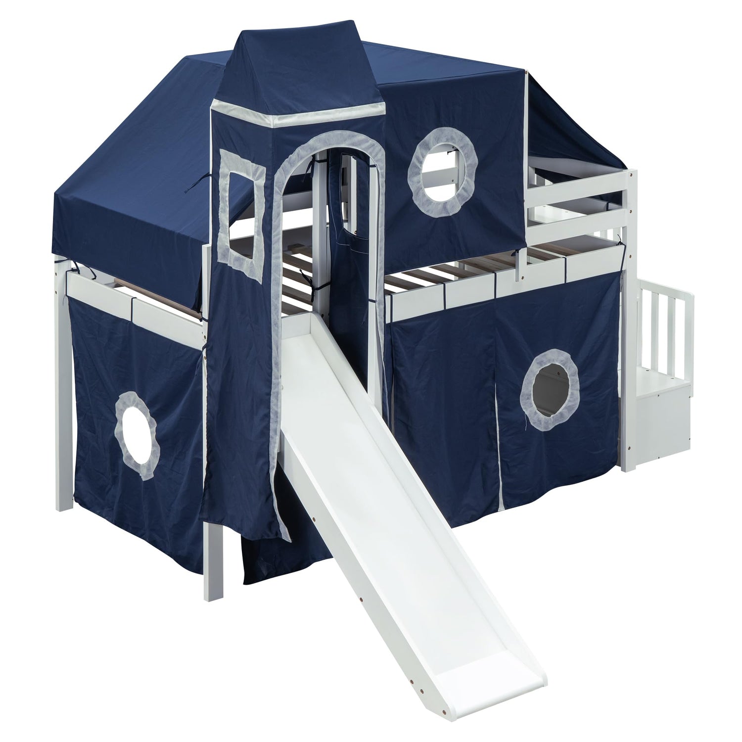 - 【High-Quality Twin Loft Bed Frame】The twin loft bed with tent and slide is constructed from selected solid pine wood and MDF and iron alloy bolts which keeps the whole bed sturdy and wobble free, make sure it doesn't squeak when using to give your child a good night's sleep. The strengthened frame is capable of holding up to 350lbs on the top loft bed.