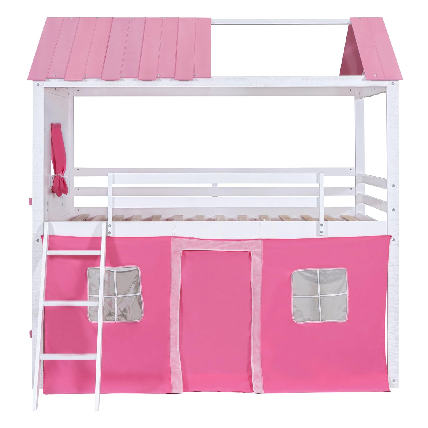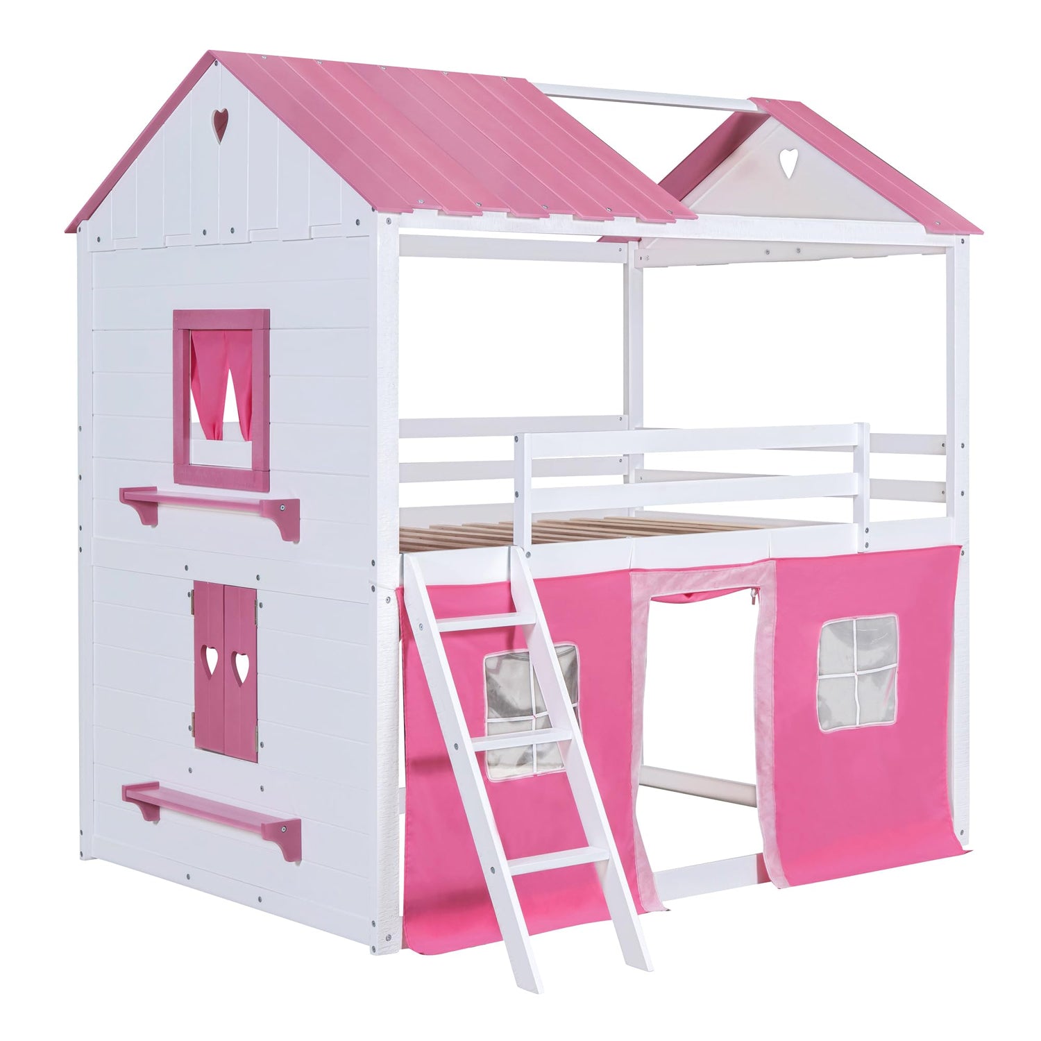 Harper & Bright Designs House Twin Loft Bunk Bed with Tent, Kids Loft Bed with Ladders,Guardrail, Windows and Roof, Wood Twin Over Twin Playhouse Bunk Bed for Kids Teens Boys & Girls (Pink & White)