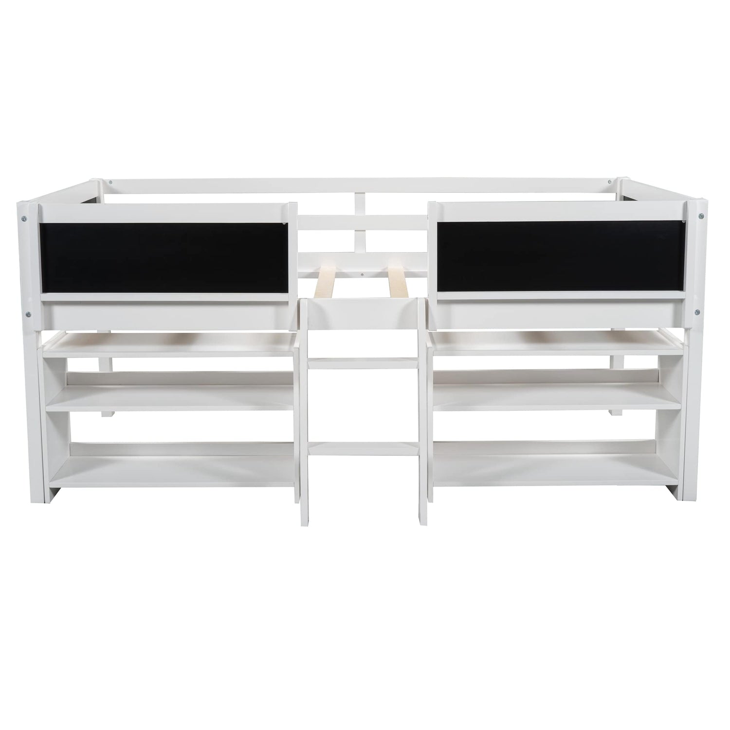 Harper & Bright Designs Kids Low Loft Bed with 2 Movable Storage Shelves, Twin Loft Bed Frame with Chalkboard and Ladder, Multifunctional Loft Bed for Kids Boys&Girls No Box Spring Needed (White)